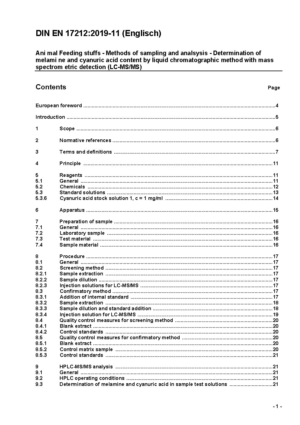 Animal Feeding stuffs - Methods of sampling and analsysis - Determination of melamine and cyanuric acid content by liquid chromatographic method with mass spectrometric detection (LC-MS/MS); German version EN 17212:2019