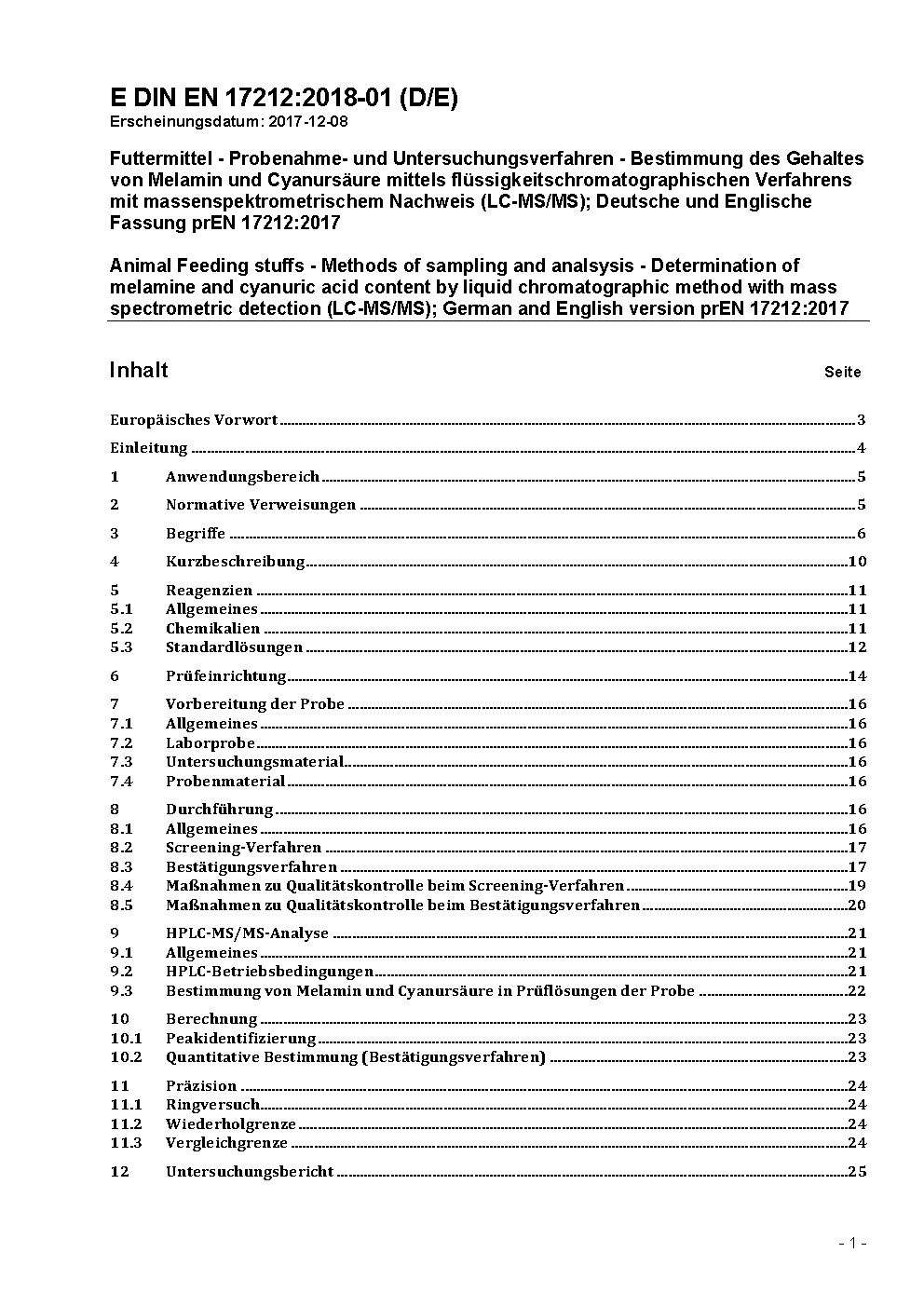 Futtermittel - Probenahme- und Untersuchungsverfahren - Bestimmung des Gehaltes von Melamin und Cyanursäure mittels flüssigkeitschromatographischem Verfahren mit massenspektrometrischem Nachweis (LC-MS/MS); Deutsche Fassung EN 17212:2019