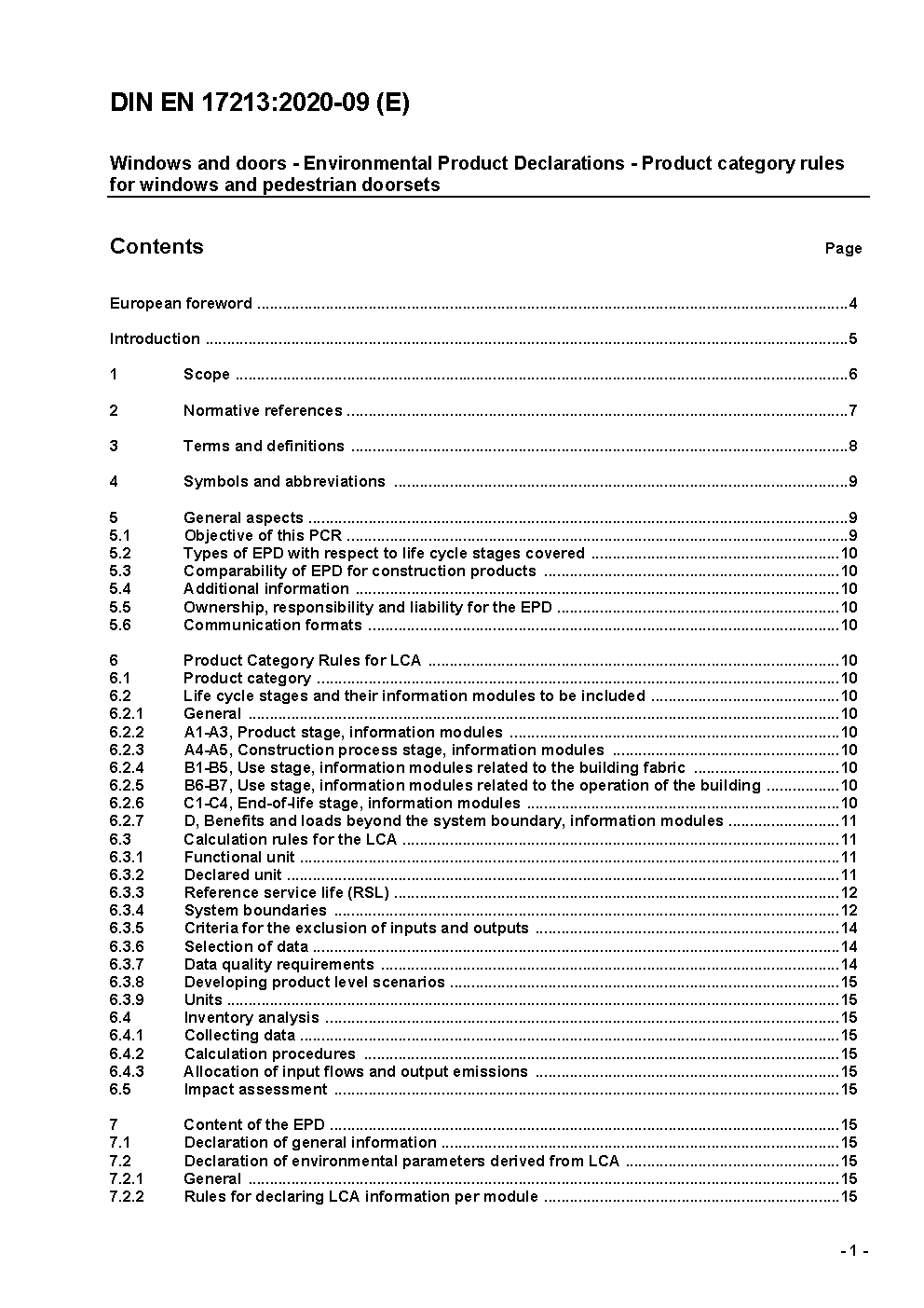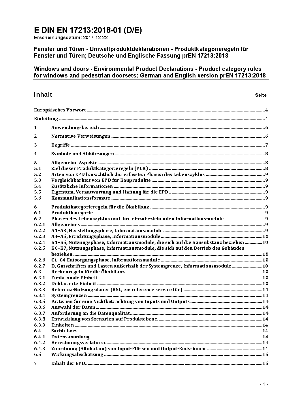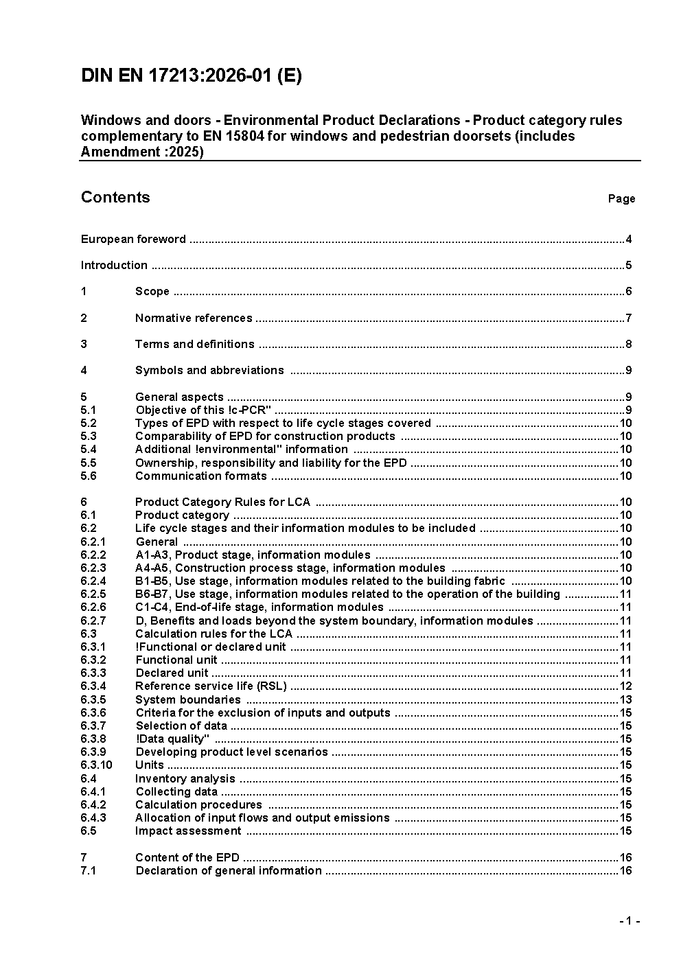 Windows and doors - Environmental Product Declarations - Product category rules complementary to EN 15804 for windows and pedestrian doorsets; German version EN 17213:2020+A1:2025.