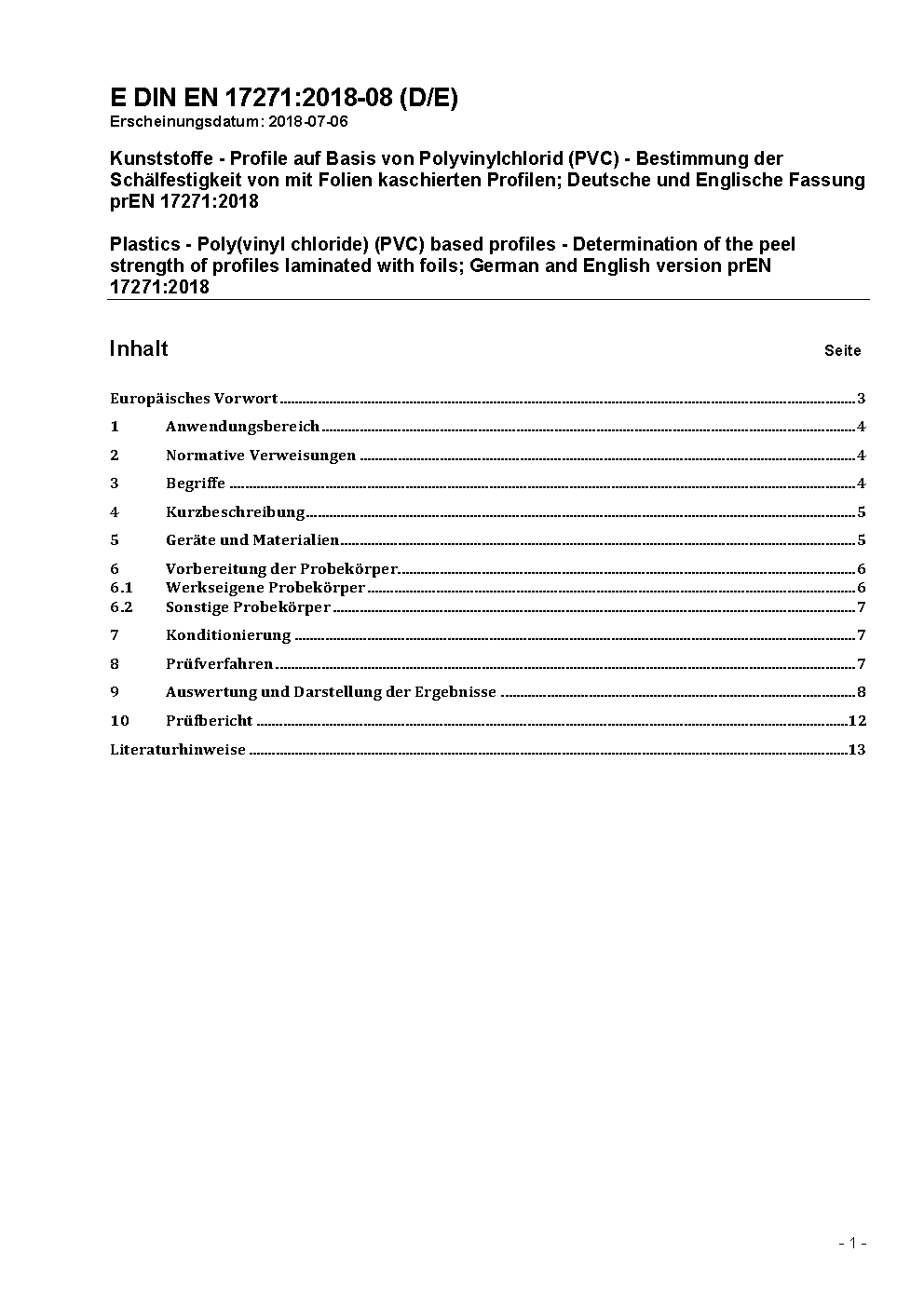 Kunststoffe - Profile auf Basis von Polyvinylchlorid (PVC) - Bestimmung der Schälfestigkeit von mit Folien kaschierten Profilen; Deutsche und Englische Fassung prEN 17271:2018