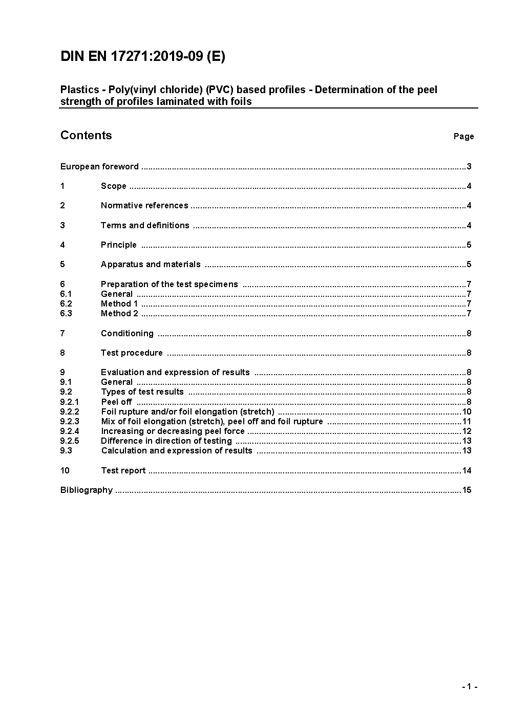 Plastics - Poly(vinyl chloride) (PVC) based profiles - Determination of the peel strength of profiles laminated with foils; German and English version prEN 17271:2018