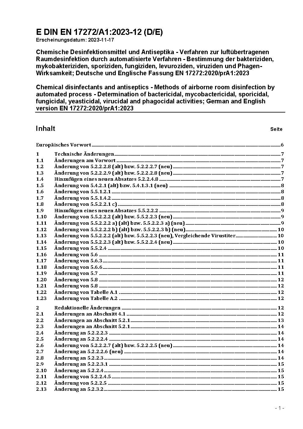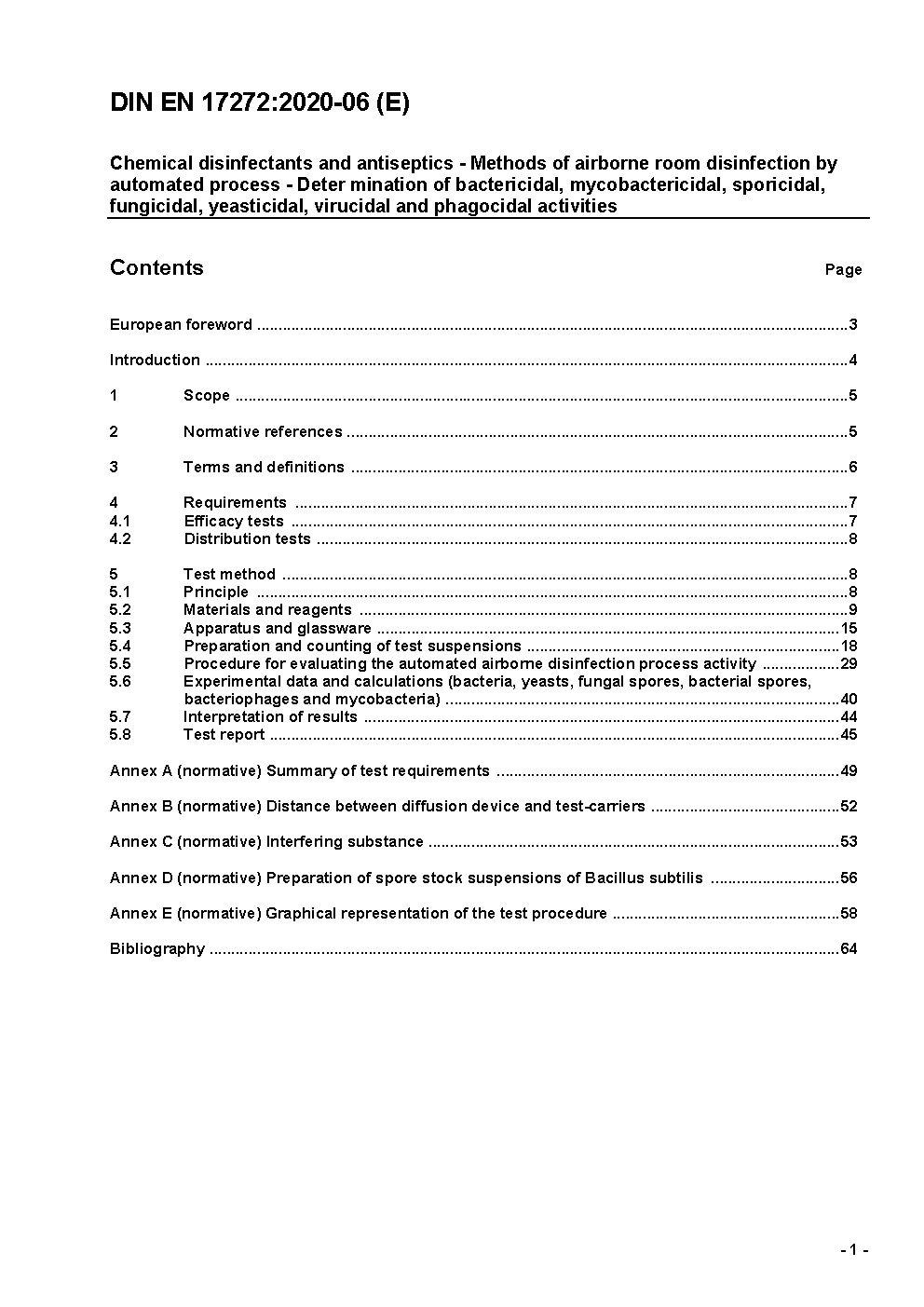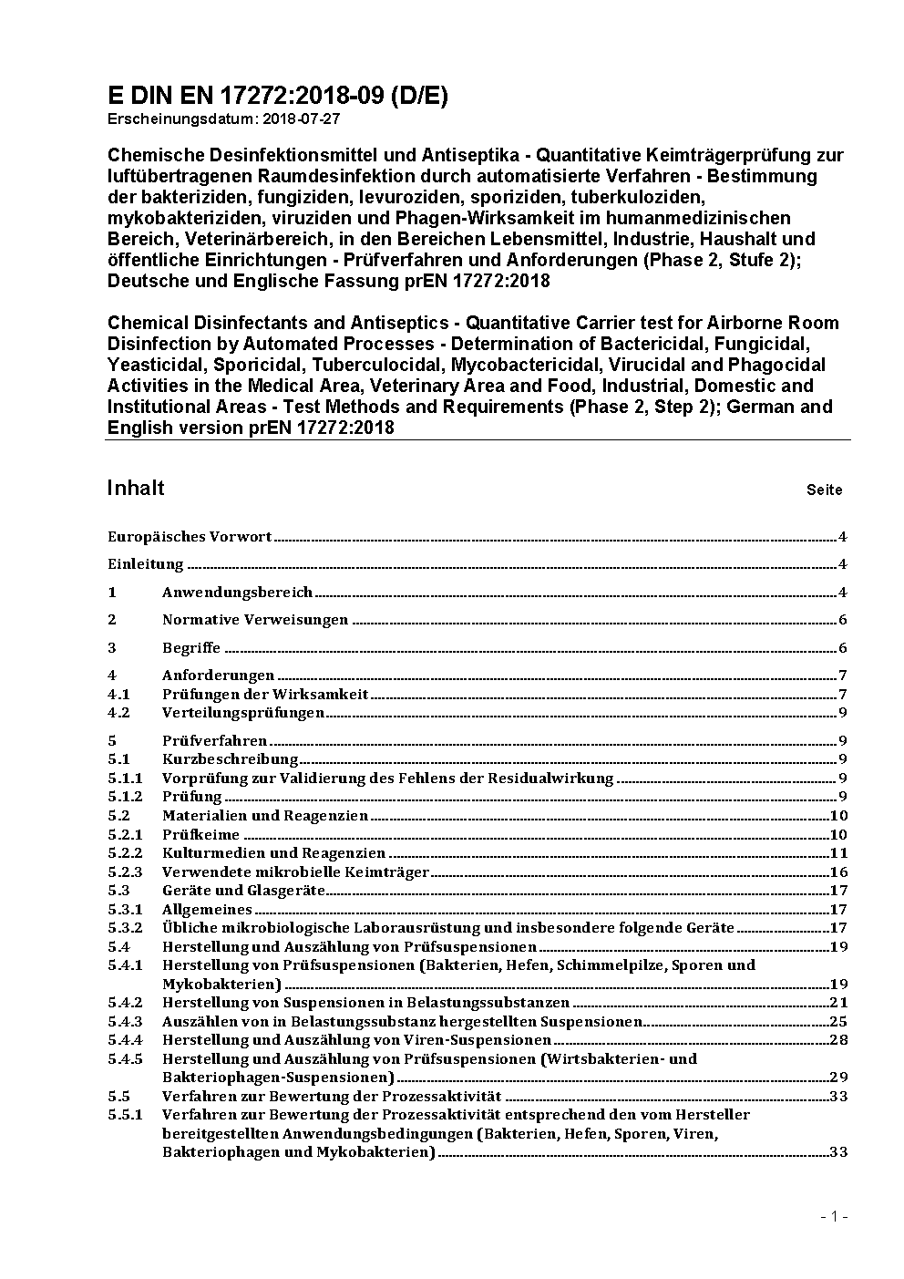 Chemische Desinfektionsmittel und Antiseptika - Quantitative Keimträgerprüfung zur luftübertragenen Raumdesinfektion durch automatisierte Verfahren - Bestimmung der bakteriziden, fungiziden, levuroziden, sporiziden, tuberkuloziden, mykobakteriziden, viruziden und Phagen-Wirksamkeit im humanmedizinischen Bereich, Veterinärbereich, in den Bereichen Lebensmittel, Industrie, Haushalt und öffentliche Einrichtungen - Prüfverfahren und Anforderungen (Phase 2, Stufe 2); Deutsche und Englische Fassung prEN 17272:2018
