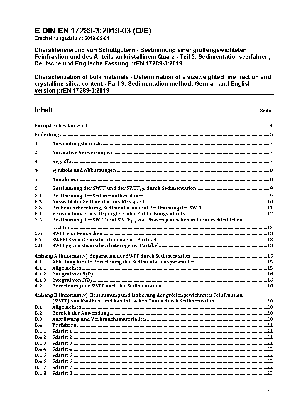 Charakterisierung von Schüttgütern - Bestimmung einer größengewichteten Feinfraktion und des Anteils an kristallinem Quarz - Teil 3: Sedimentationsverfahren; Deutsche Fassung EN 17289-3:2020