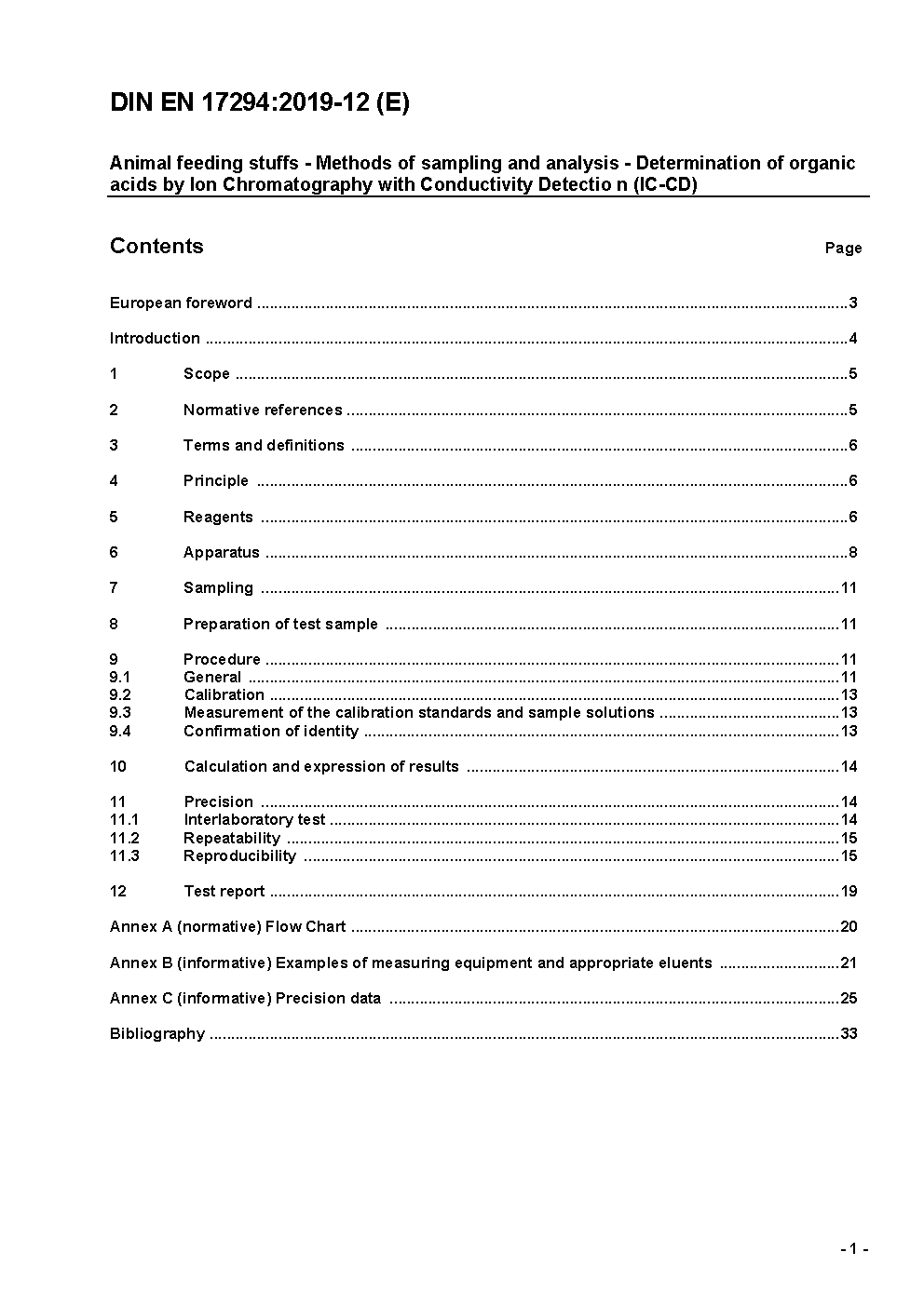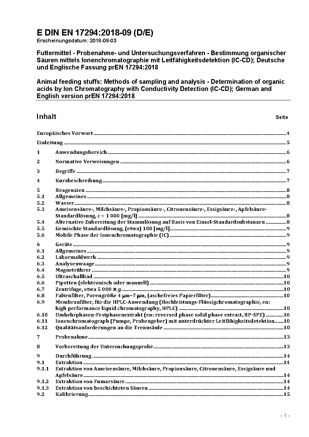 Futtermittel - Probenahme- und Untersuchungsverfahren - Bestimmung organischer Säuren mittels Ionenchromatographie mit Leitfähigkeitsdetektion (IC-CD); Deutsche und Englische Fassung prEN 17294:2018