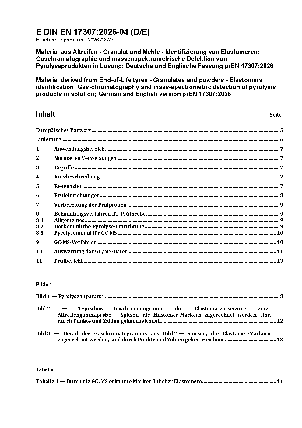 Material aus Altreifen - Granulat und Mehle - Identifizierung von Elastomeren: Gaschromatographie und massenspektrometrische Detektion von Pyrolyseprodukten in Lösung; Deutsche und Englische Fassung prEN 17307:2026