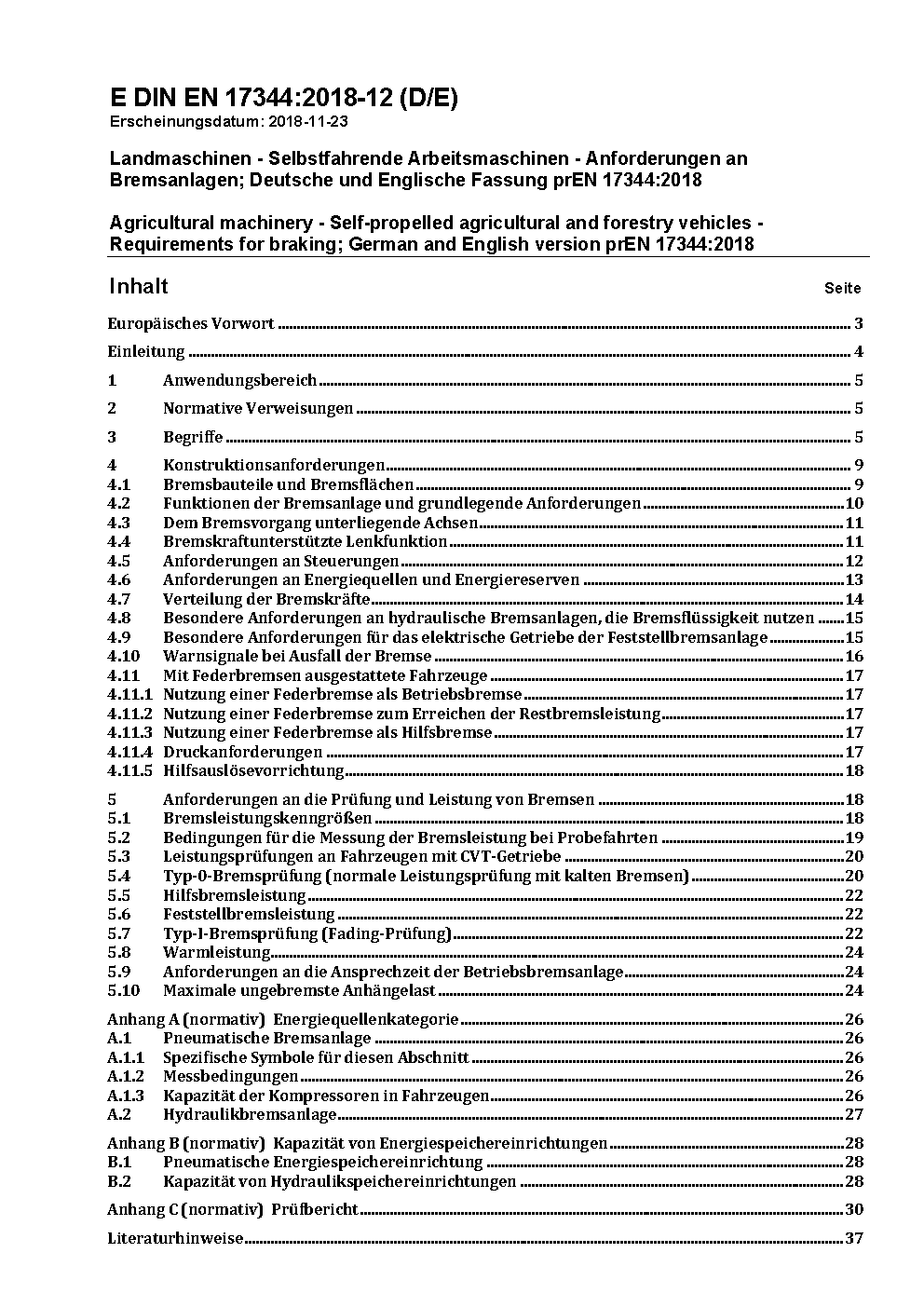 Landmaschinen - Selbstfahrende Arbeitsmaschinen - Anforderungen an Bremsanlagen; Deutsche und Englische Fassung prEN 17344:2018