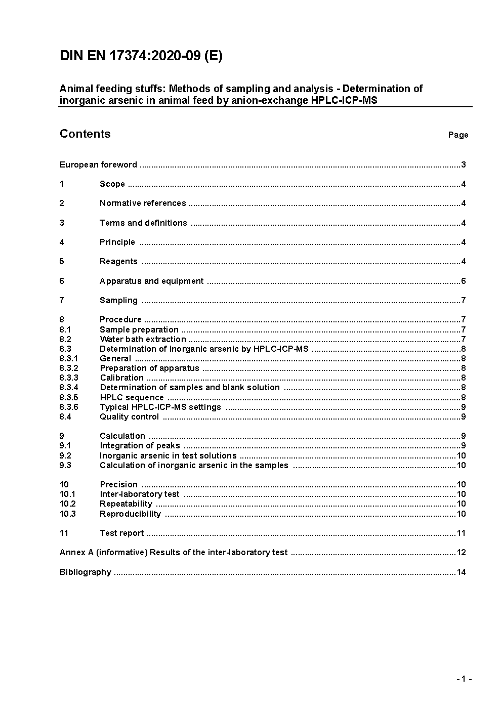 Animal feeding stuffs: Methods of sampling and analysis - Determination of inorganic arsenic in animal feed by anion-exchange HPLC-ICPMS; German and English version prEN 17374:2019