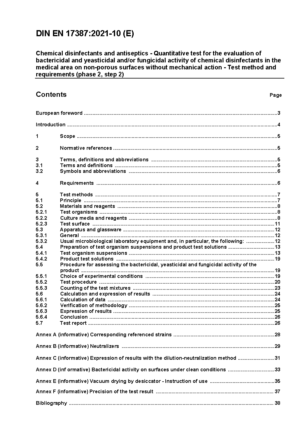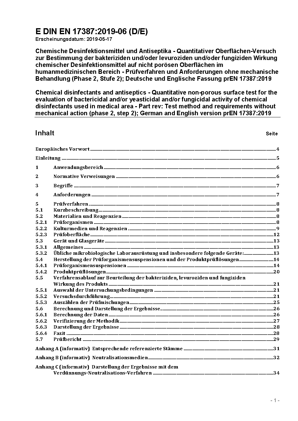 Chemische Desinfektionsmittel und Antiseptika - Quantitativer Oberflächen-Versuch zur Bestimmung der bakteriziden und/oder levuroziden und/oder fungiziden Wirkung chemischer Desinfektionsmittel auf nicht porösen Oberflächen im humanmedizinischen Bereich - Prüfverfahren und Anforderungen ohne mechanische Behandlung (Phase 2, Stufe 2); Deutsche und Englische Fassung prEN 17387:2019