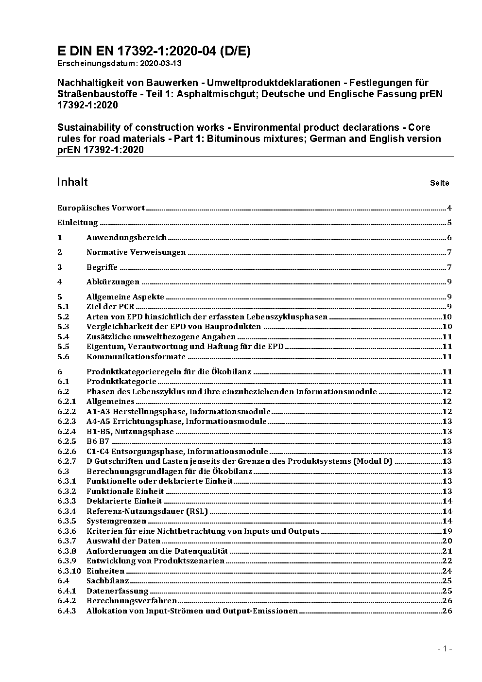 Nachhaltigkeit von Bauwerken - Umweltproduktdeklarationen - Festlegungen für Straßenbaustoffe - Teil 1: Asphaltmischgut; Deutsche und Englische Fassung prEN 17392-1:2020