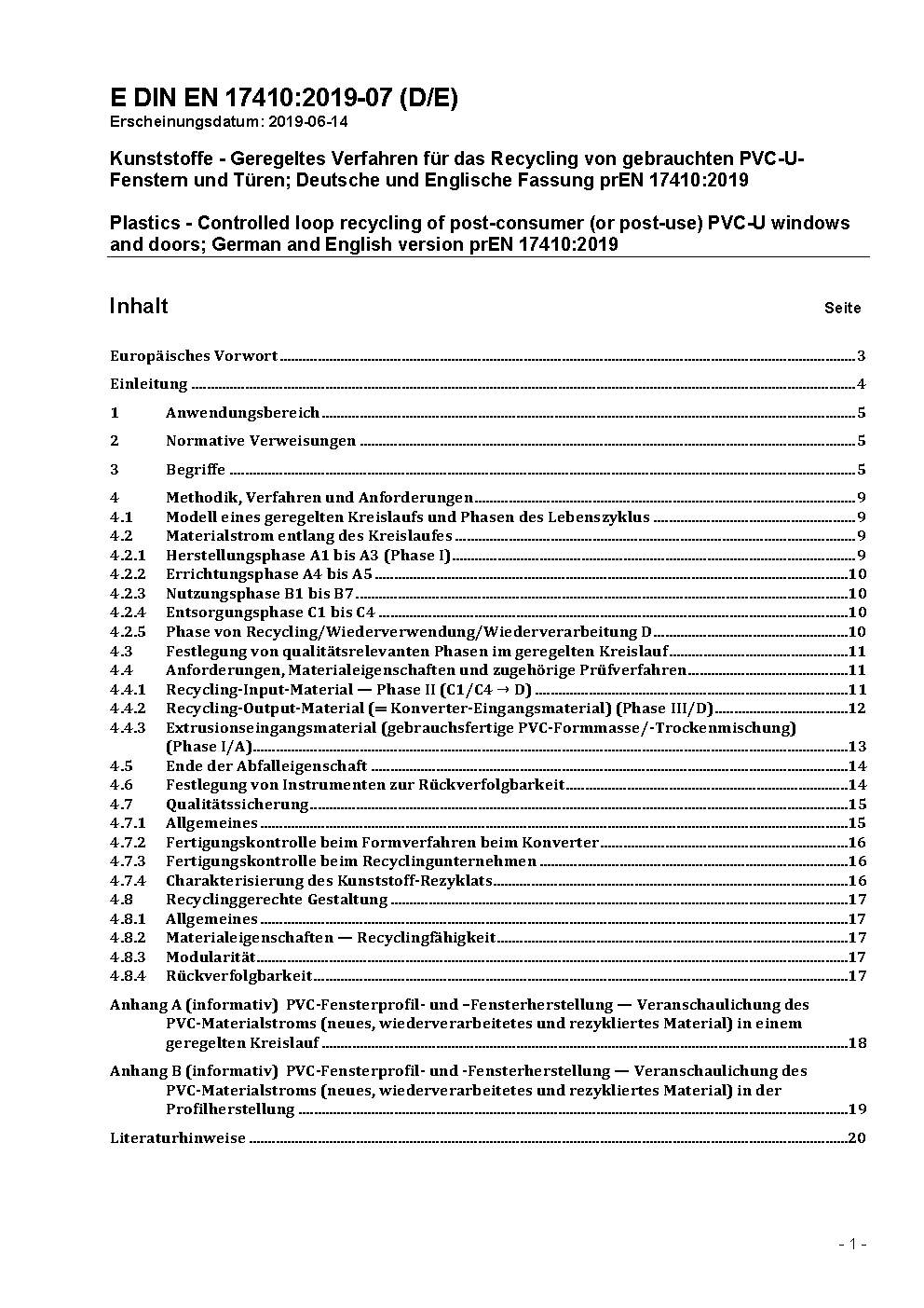 Kunststoffe - Geregelter Recyclingkreislauf von Fenster- und Türprofilen aus PVC-U; Deutsche Fassung EN 17410:2021