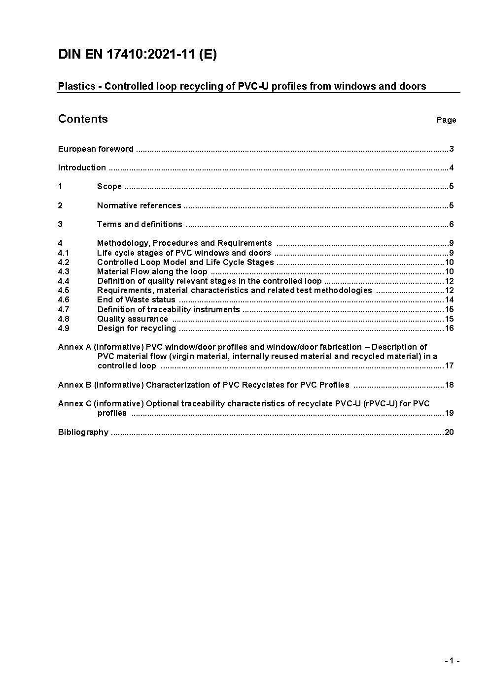 Plastics - Controlled loop recycling of PVC-U profiles from windows and doors; German version EN 17410:2021
