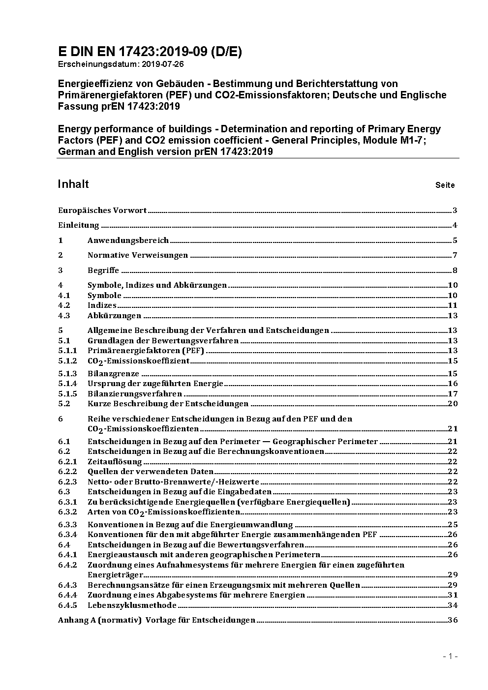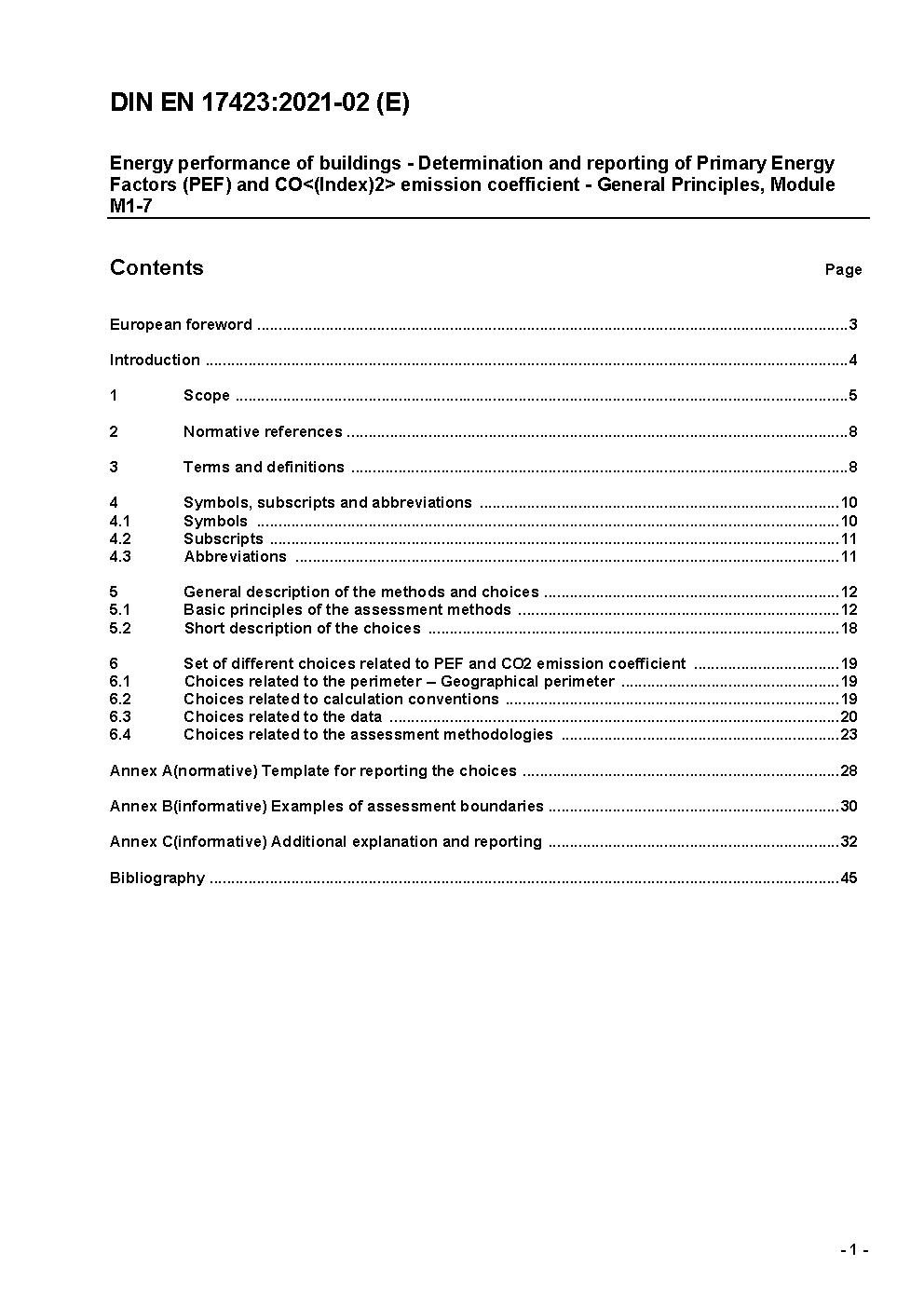 Energy performance of buildings - Determination and reporting of Primary Energy Factors (PEF) and CO<(Index)2> emission coefficient - General Principles, Module M1-7; German version EN 17423:2020