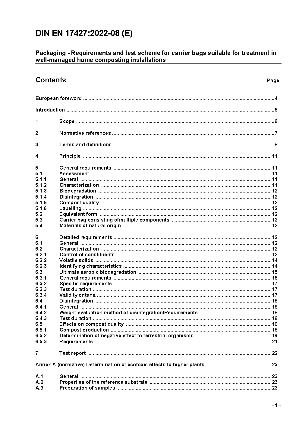 Packaging - Requirements and test scheme for carrier bags suitable for treatment in well-managed home composting installations; German version EN 17427:2022