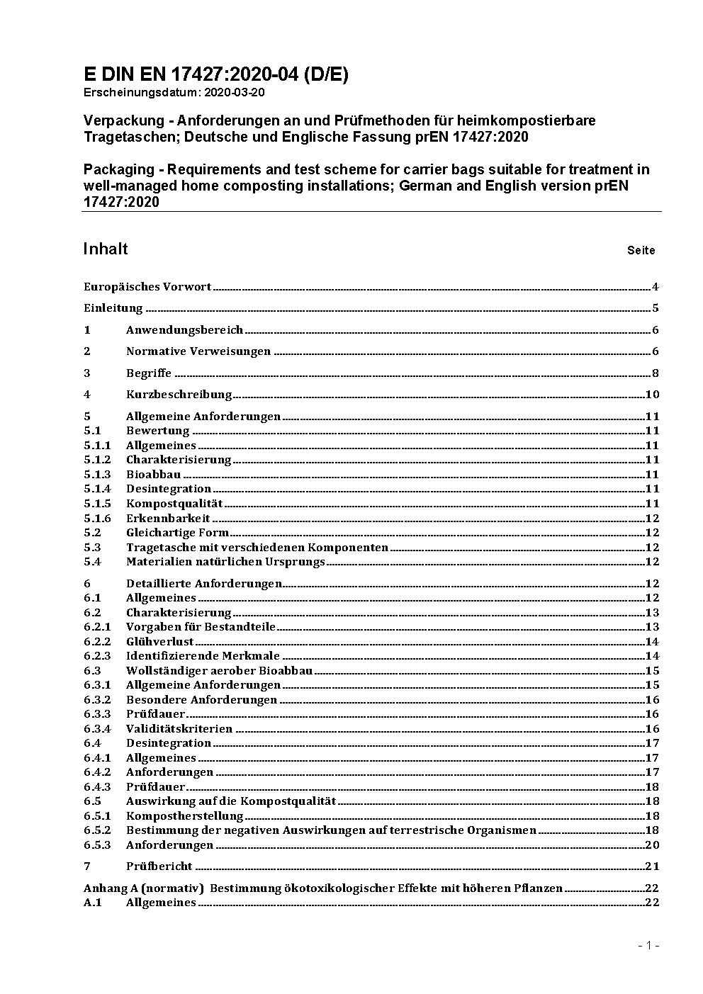 Verpackung - Anforderungen an und Prüfmethoden für heimkompostierbare Tragetaschen in einer kontrollierten Heimkompostieranlage; Deutsche Fassung EN 17427:2022