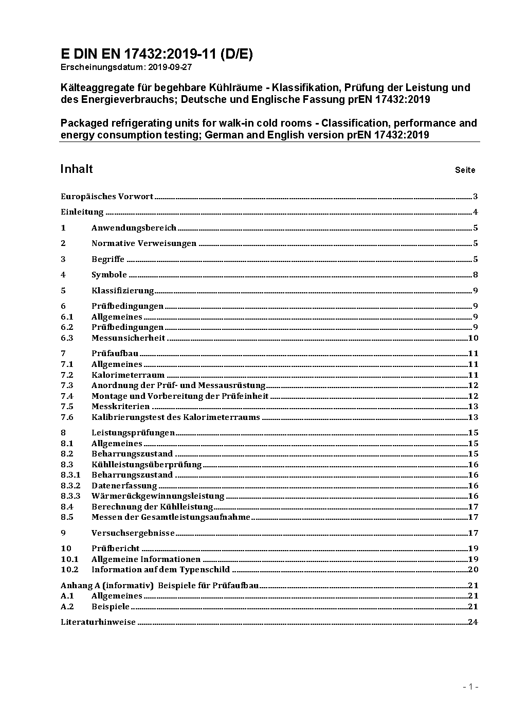 Kälteaggregate für begehbare Kühlräume - Klassifikation, Prüfung der Leistung und des Energieverbrauchs; Deutsche Fassung EN 17432:2021