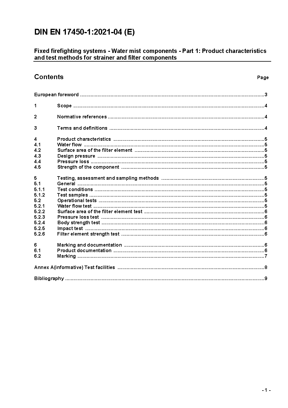 Fixed firefighting systems - Water mist components - Part 1: Product characteristics and test methods for strainer and filter components; German version EN 17450-1:2021