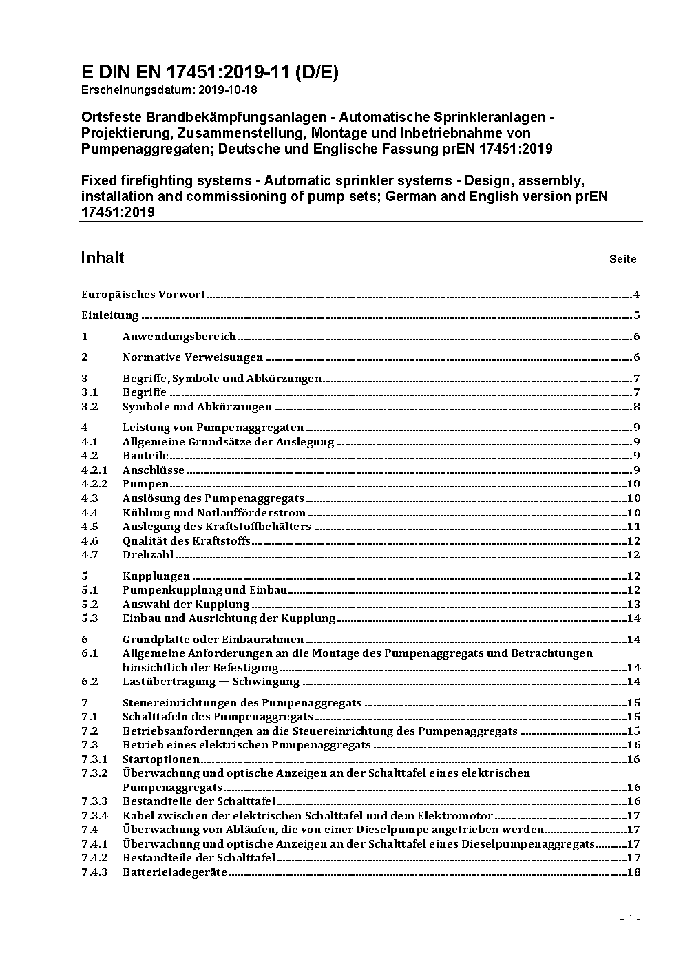 Ortsfeste Brandbekämpfungsanlagen - Automatische Sprinkleranlagen - Projektierung, Zusammenbau, Montage und Inbetriebnahme von Pumpenaggregaten; Deutsche Fassung EN 17451:2024