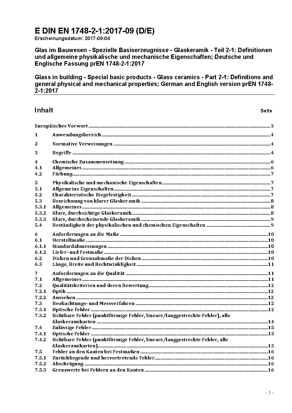 Glas im Bauwesen - Spezielle Basiserzeugnisse - Teil 2-1: Glaskeramik - Definition und Beschreibung; Deutsche Fassung prEN 1748-2-1:2003