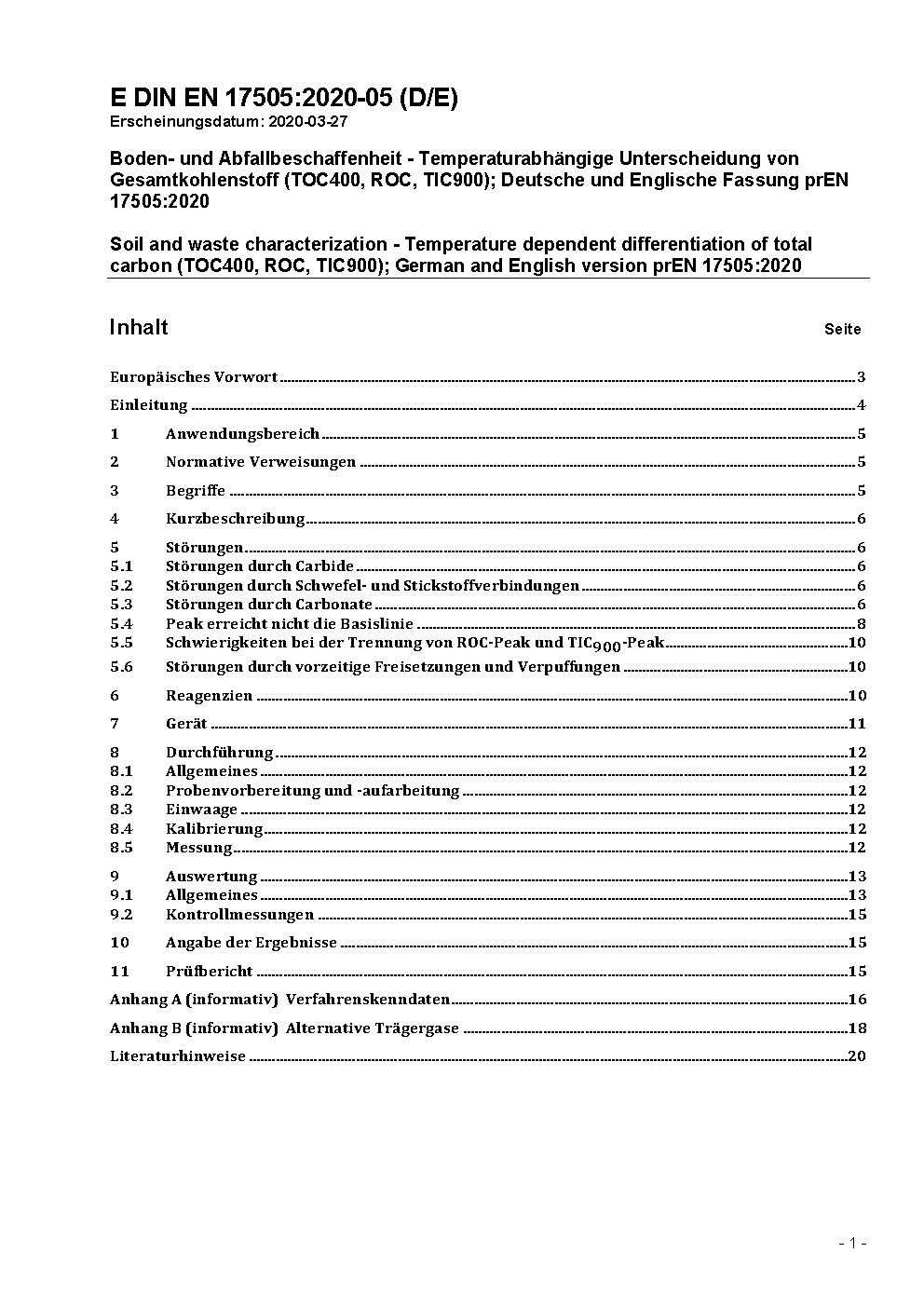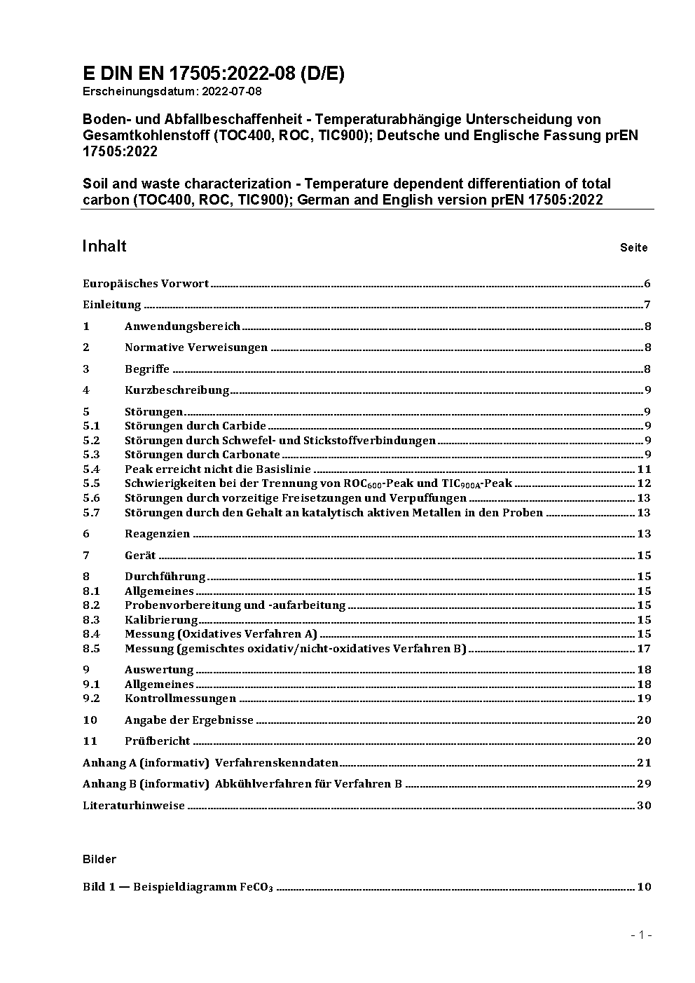 Soil and waste characterization - Temperature dependent differentiation of total carbon (TOC400, ROC, TIC900); German and English version prEN 17505:2022