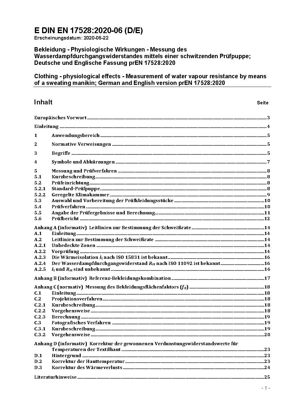 Bekleidung - Physiologische Wirkungen - Messung des Wasserdampfdurchgangswiderstandes mittels einer schwitzenden Prüfpuppe; Deutsche und Englische Fassung prEN 17528:2020