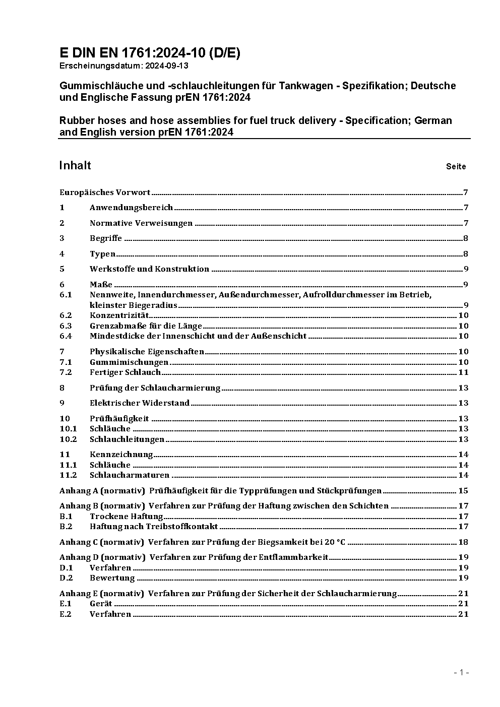 Gummischläuche und -schlauchleitungen für Tankwagen - Spezifikation; Deutsche Fassung EN 1761:1999