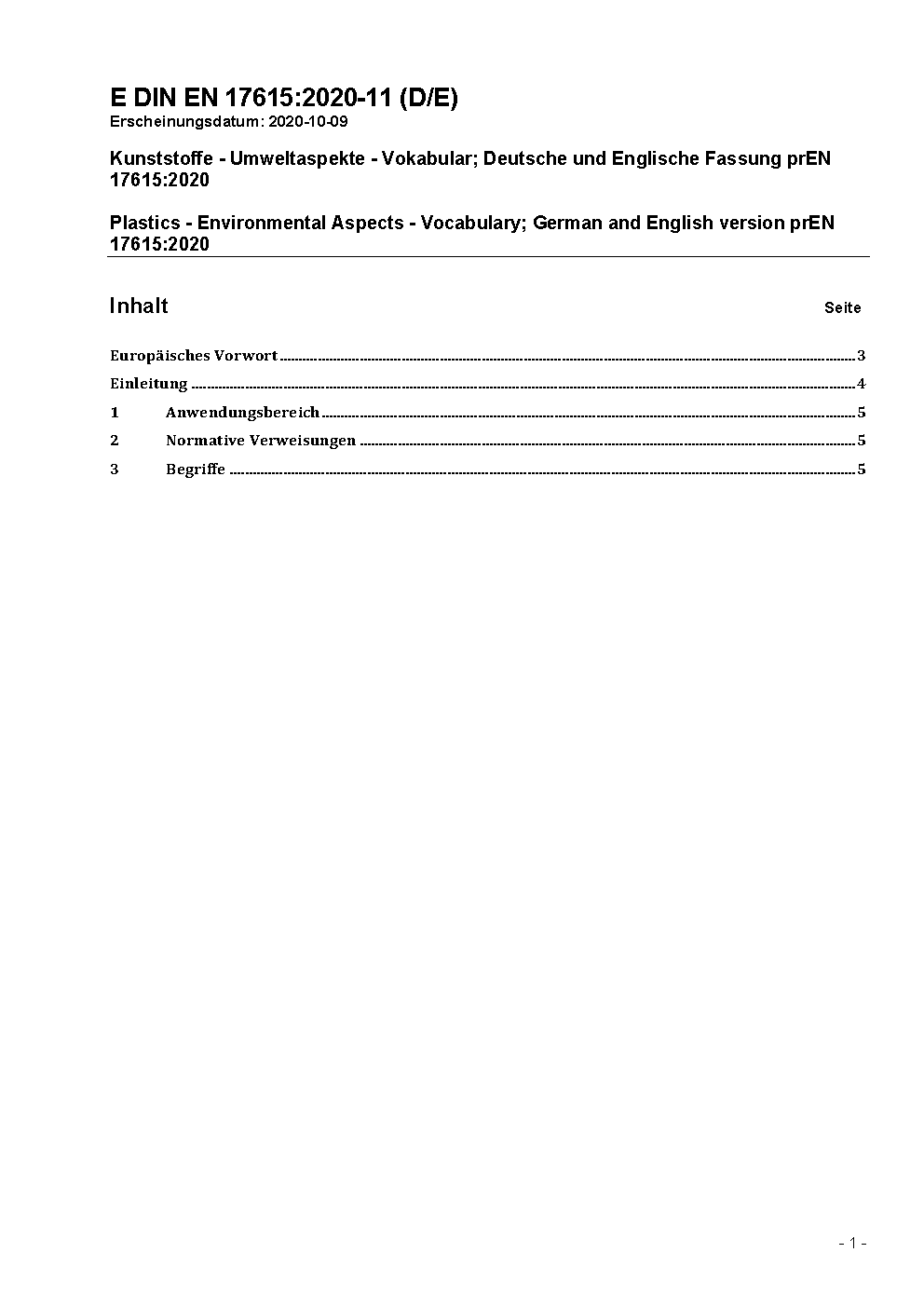 Kunststoffe - Umweltaspekte - Vokabular; Deutsche und Englische Fassung prEN 17615:2020
