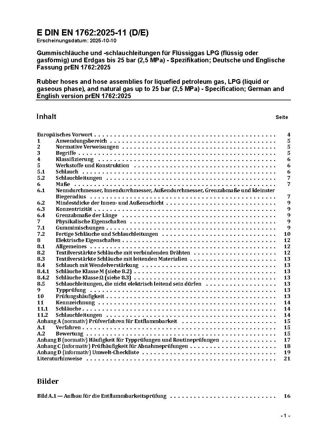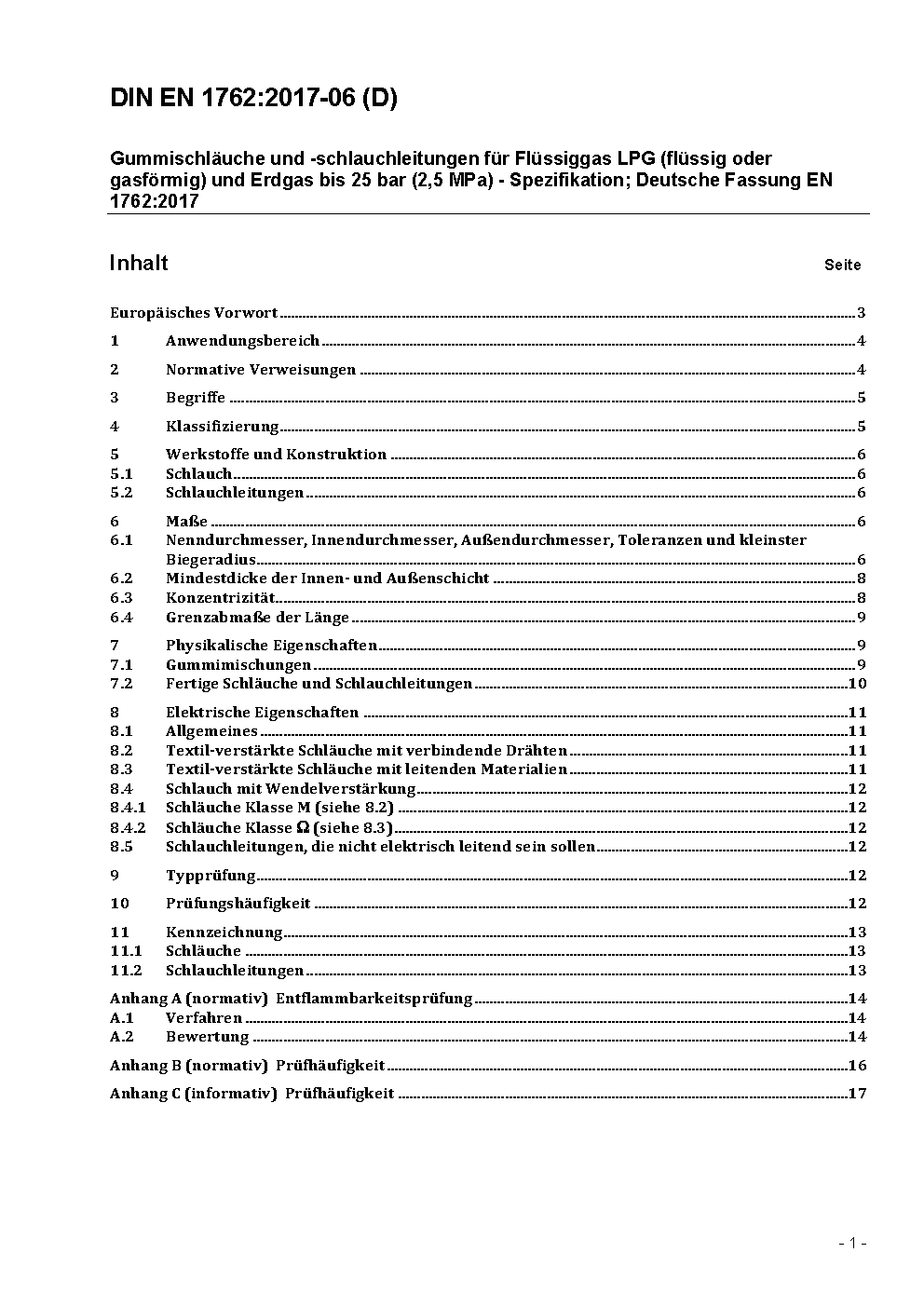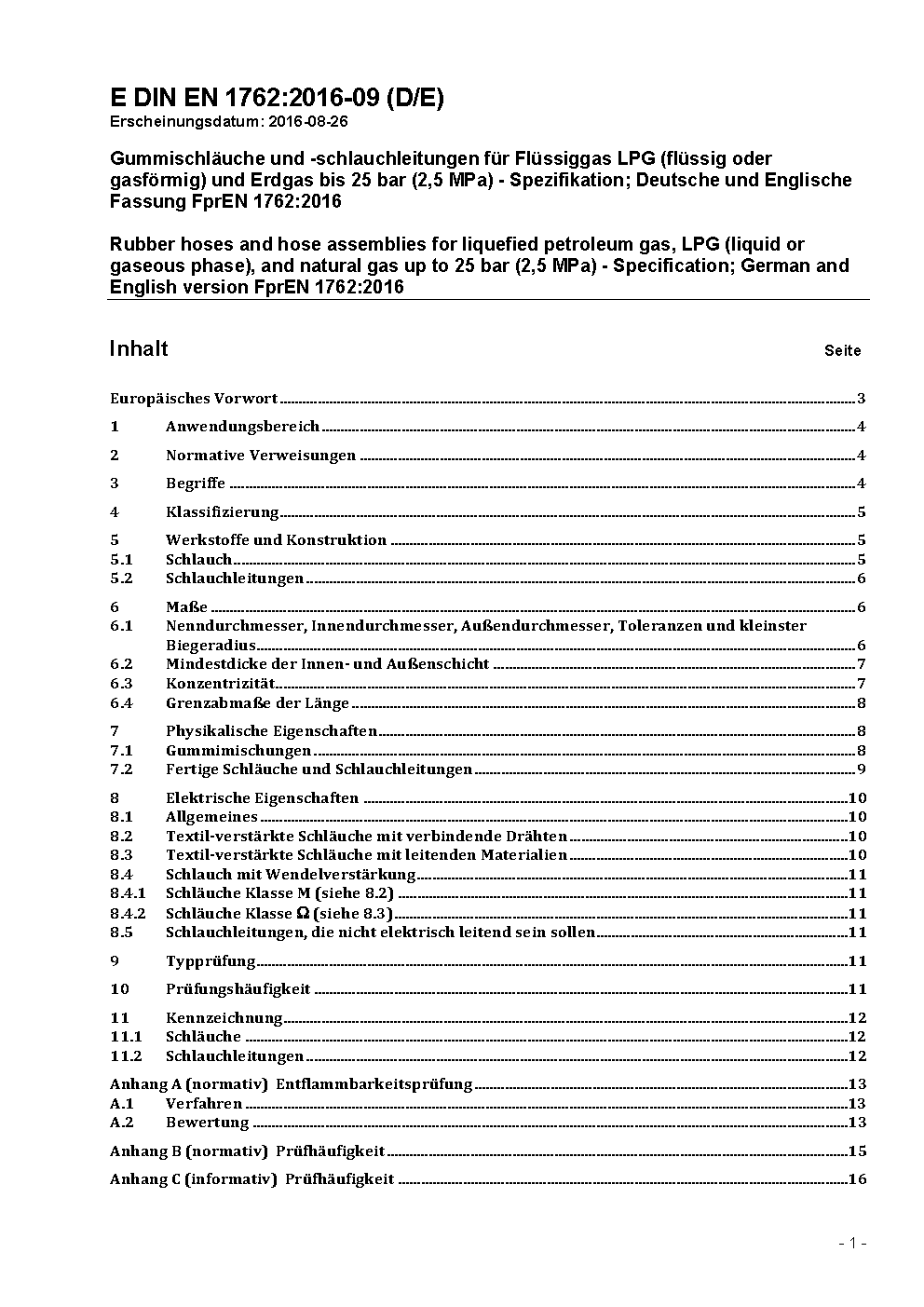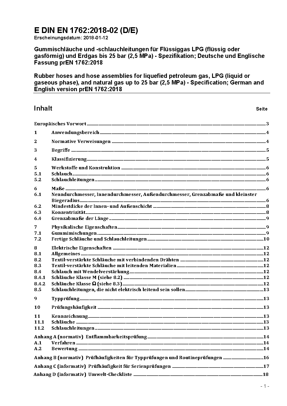 Gummischläuche und -schlauchleitungen für Flüssiggas LPG (flüssig oder gasförmig) und Erdgas bis 25 bar (2,5 MPa) - Spezifikation; Deutsche Fassung EN 1762:2003