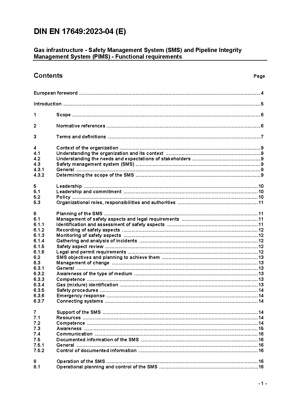 Gas infrastructure - Safety Management System (SMS) and Pipeline Integrity Management System (PIMS) - Functional requirements; German version EN 17649:2022.