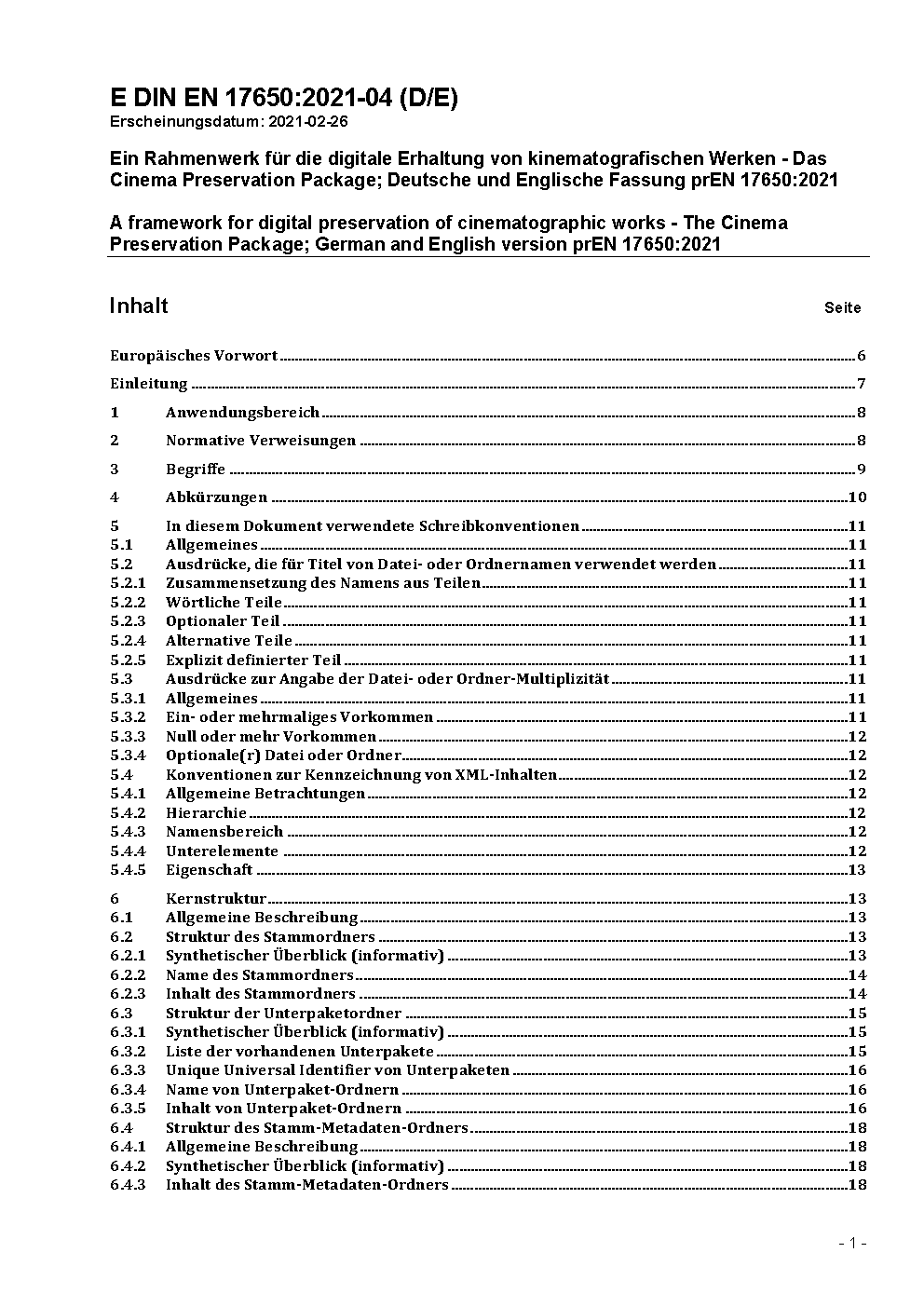 Ein Rahmenwerk für die digitale Erhaltung von kinematografischen Werken - Das Cinema Preservation Package; Deutsche und Englische Fassung prEN 17650:2021