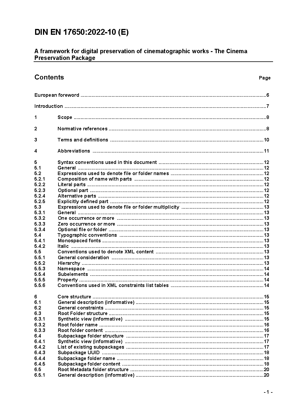 A framework for digital preservation of cinematographic works - The Cinema Preservation Package; German and English version prEN 17650:2021