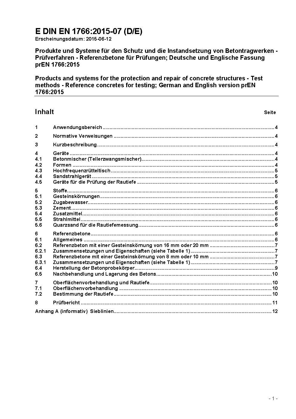 Produkte und Systeme für den Schutz und die Instandsetzung von Betontragwerken - Prüfverfahren - Referenzbetone für Prüfungen; Deutsche Fassung EN 1766:2000 / Achtung: Übergangsfrist, festgelegt durch DIN EN 1766 (2017-05), bis 2018-11-30 beachten.