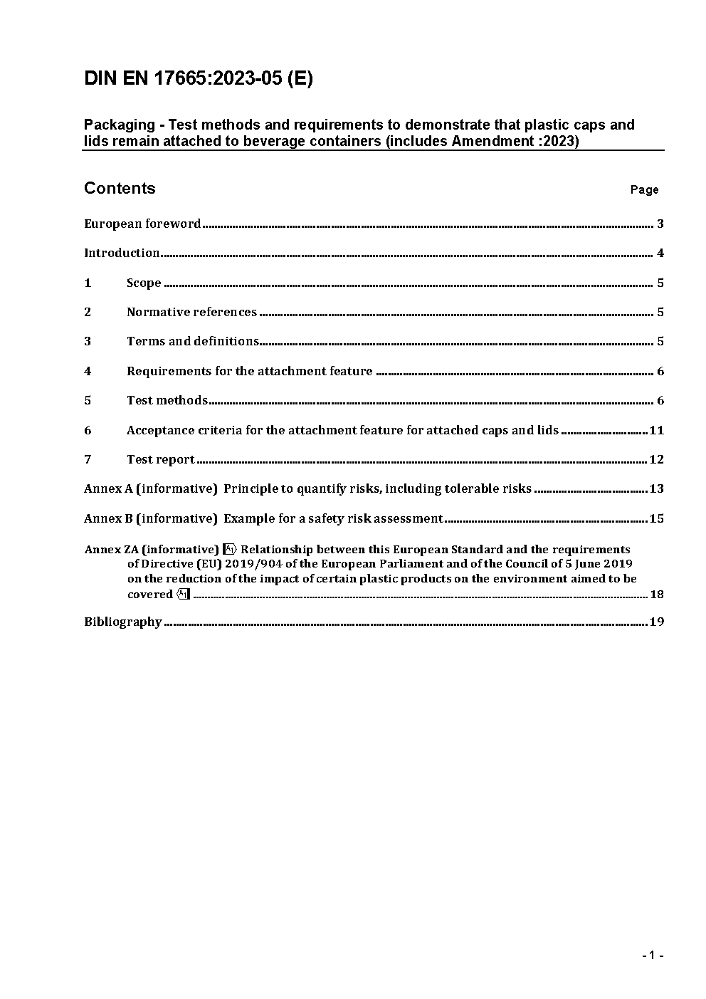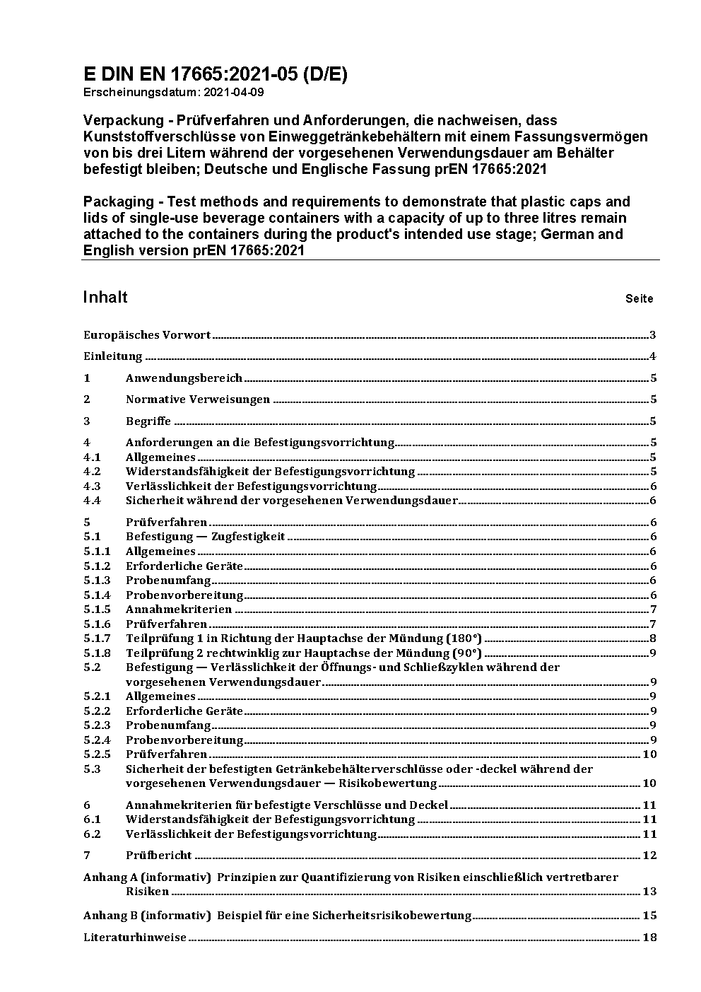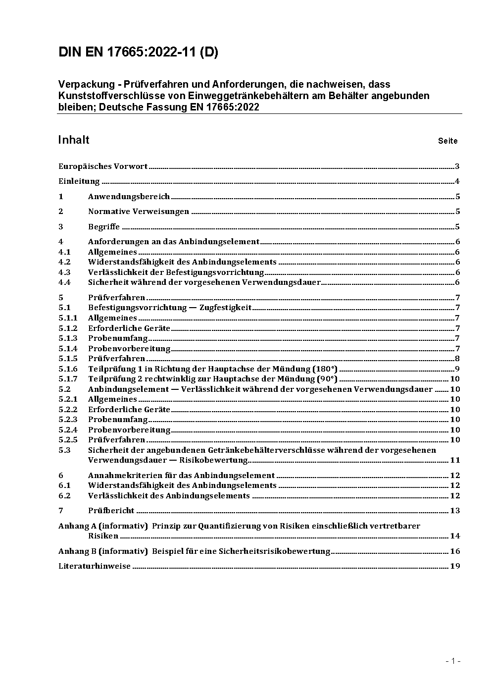 Verpackung - Prüfverfahren und Anforderungen zum Nachweis, dass Kunststoffverschlüsse von Getränkebehältern am Behälter befestigt bleiben; Deutsche Fassung EN 17665:2022+A1:2023