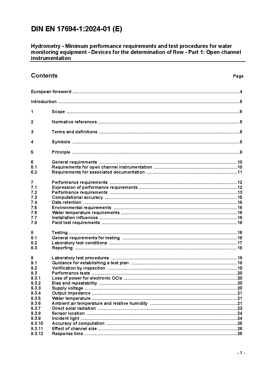 Hydrometry - Performance requirements and test procedures for water monitoring equipment - Devices for the determination of flow - Part 1: Open channel instrumentation; German and English version prEN 17694-1:2021