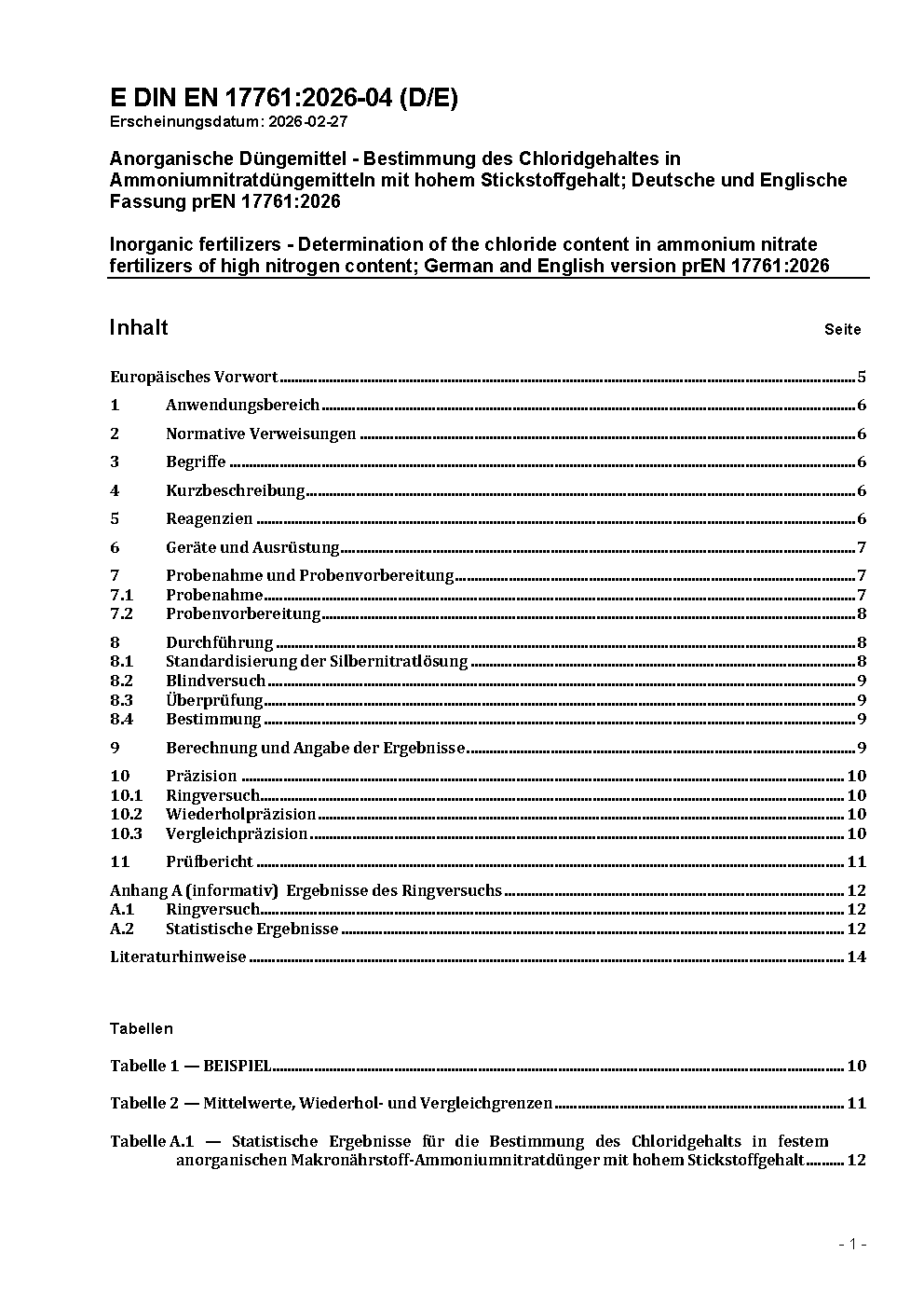 Anorganische Düngemittel - Bestimmung des Chloridgehaltes in Ammoniumnitratdüngemitteln mit hohem Stickstoffgehalt; Deutsche und Englische Fassung prEN 17761:2026