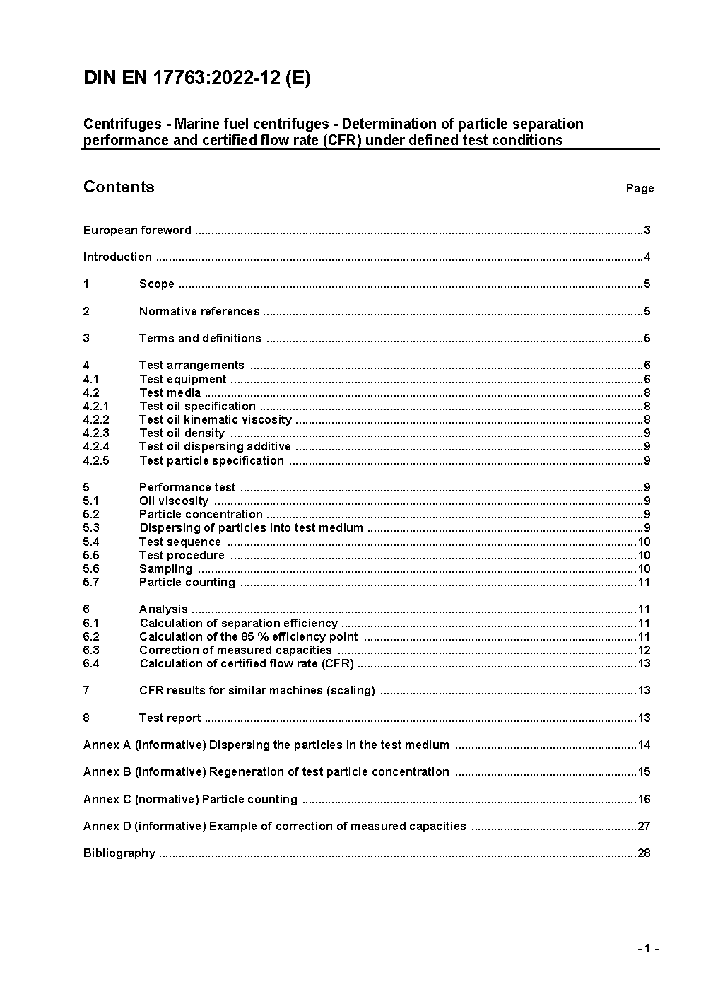 Centrifuges - Marine fuel centrifuges - Determination of particle separation performance and certified flow rate (CFR) under defined test conditions; German and English version prEN 17763:2021