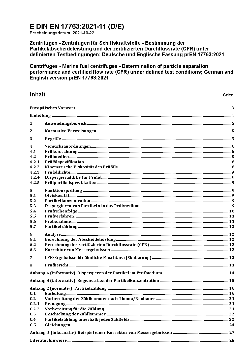 Zentrifugen - Zentrifugen für Schiffskraftstoffe - Bestimmung der Partikelabscheideleistung und der zertifizierten Durchflussrate (CFR) unter definierten Testbedingungen; Deutsche und Englische Fassung prEN 17763:2021