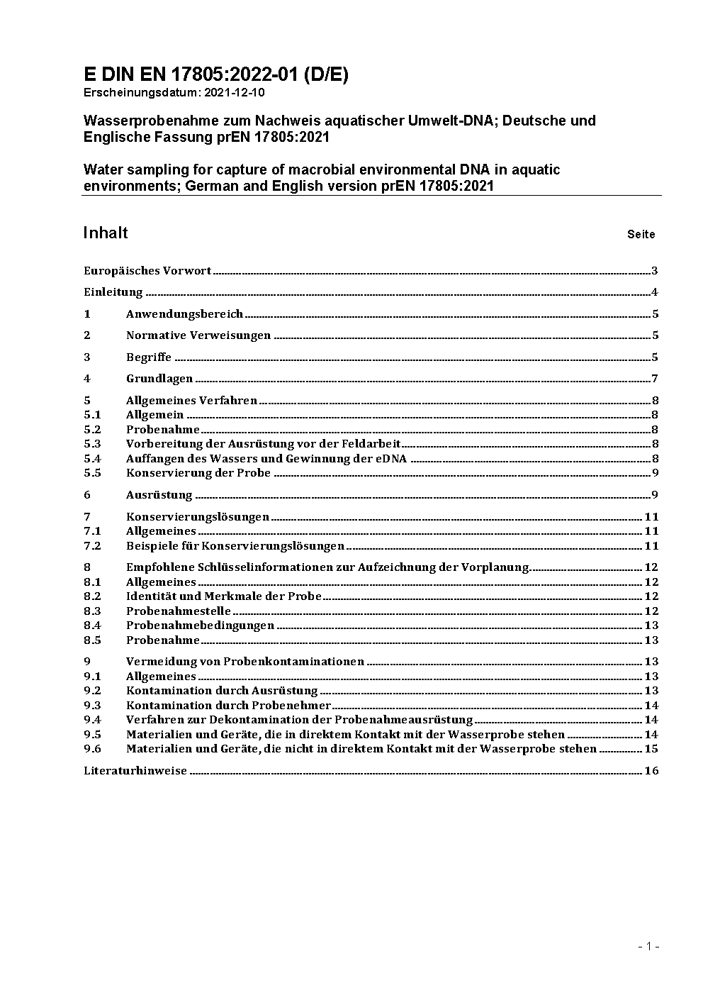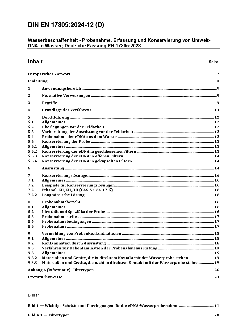 Wasserbeschaffenheit - Probenahme, Erfassung und Konservierung von Umwelt-DNA in Wasser; Deutsche Fassung EN 17805:2023