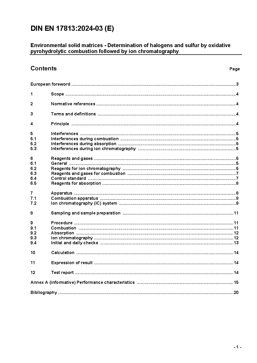Environmental matrices - Halogens and sulfur by oxidative pyrohydrolytic combustion followed by ion chromatography detection and complementary determination methods; German and English version prEN 17813:2022
