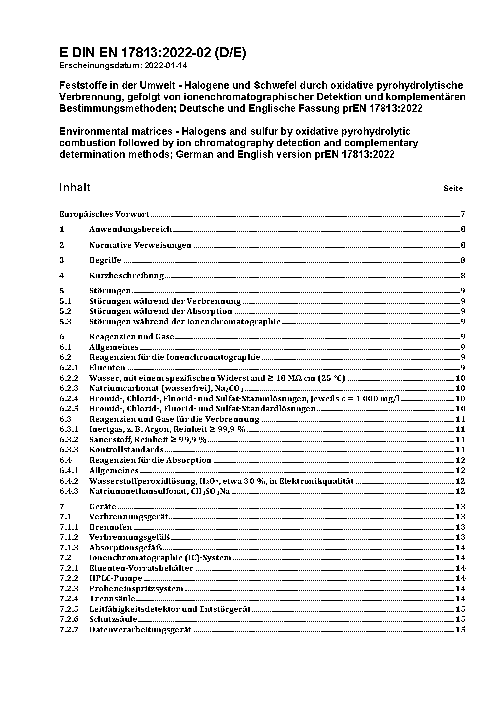 Feststoffe in der Umwelt - Halogene und Schwefel durch oxidative pyrohydrolytische Verbrennung, gefolgt von ionenchromatographischer Detektion und komplementären Bestimmungsmethoden; Deutsche und Englische Fassung prEN 17813:2022