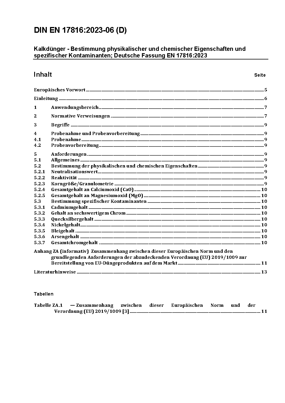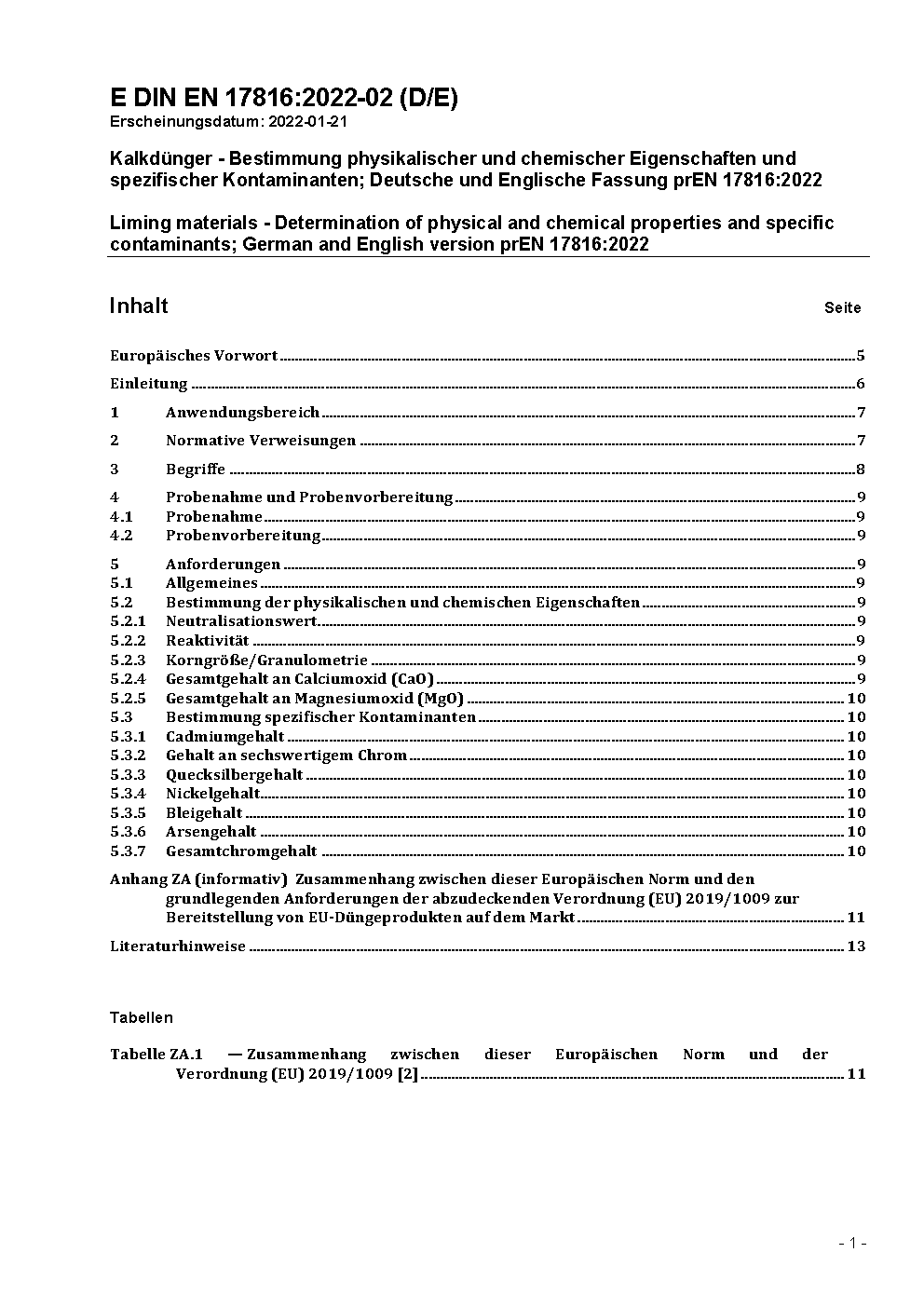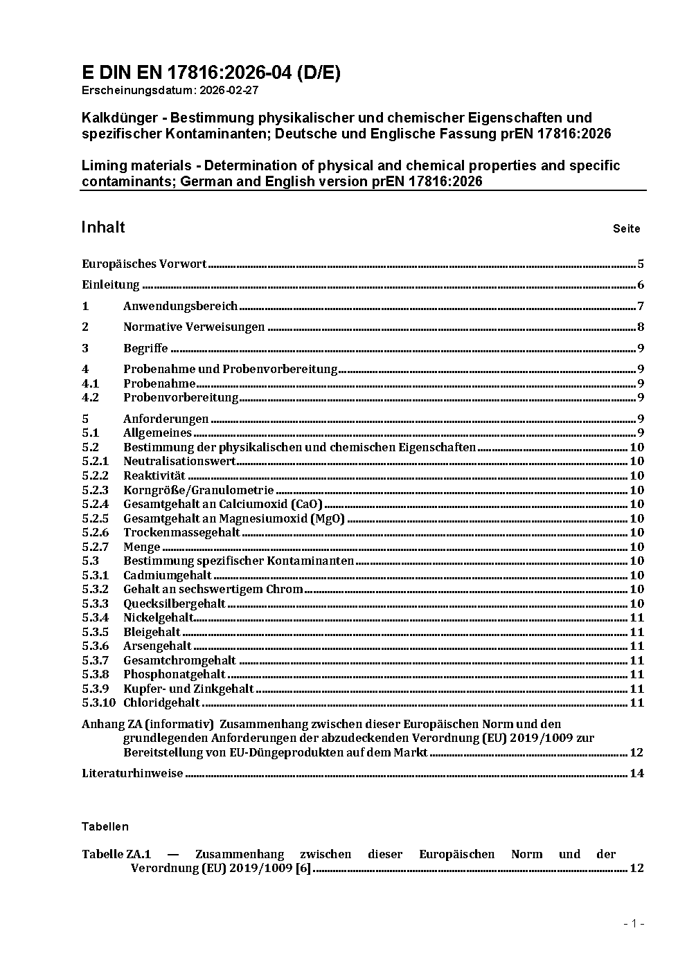 Kalkdünger - Bestimmung physikalischer und chemischer Eigenschaften und spezifischer Kontaminanten; Deutsche und Englische Fassung prEN 17816:2026
