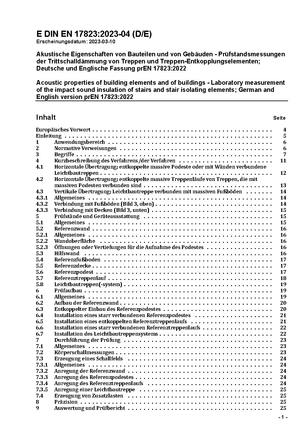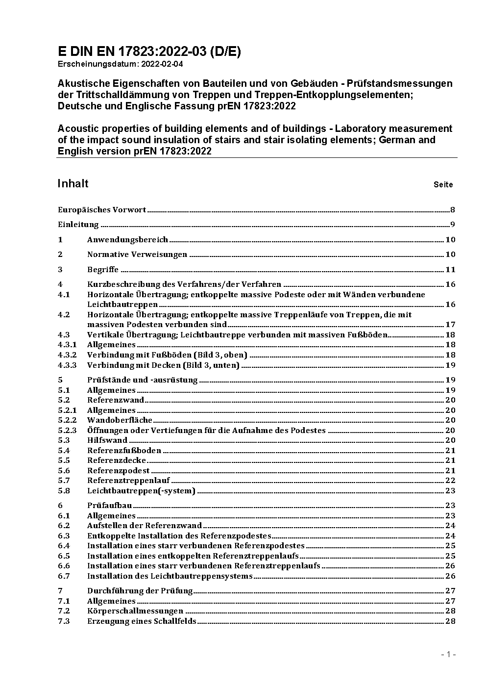Akustische Eigenschaften von Bauteilen und von Gebäuden - Prüfstandsmessungen der Trittschalldämmung von Treppen und Treppen-Entkopplungselementen; Deutsche und Englische Fassung prEN 17823:2022