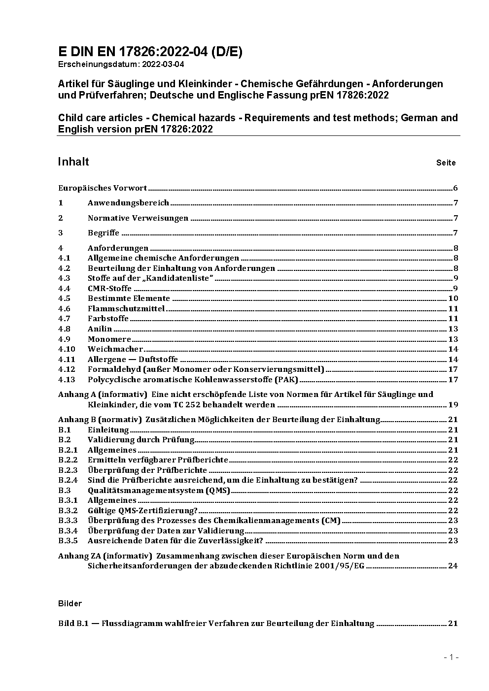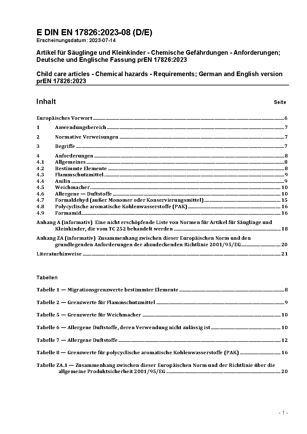 Artikel für Säuglinge und Kleinkinder - Chemische Gefährdungen - Anforderungen; Deutsche und Englische Fassung prEN 17826:2023