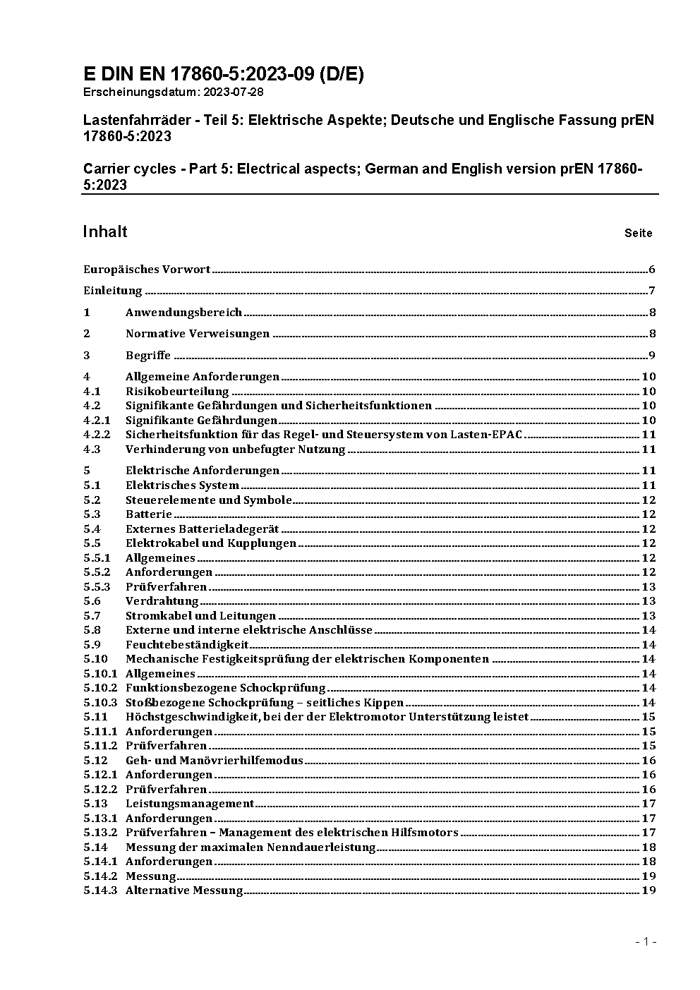 Lastenfahrräder - Teil 5: Elektrische Aspekte; Deutsche und Englische Fassung prEN 17860-5:2023