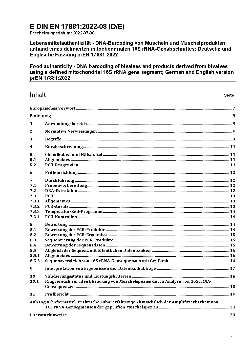 Lebensmittelauthentizität - DNA-Barcoding von Muscheln und Muschelprodukten anhand eines definierten mitochondrialen 16S rRNA-Genabschnittes; Deutsche und Englische Fassung prEN 17881:2022