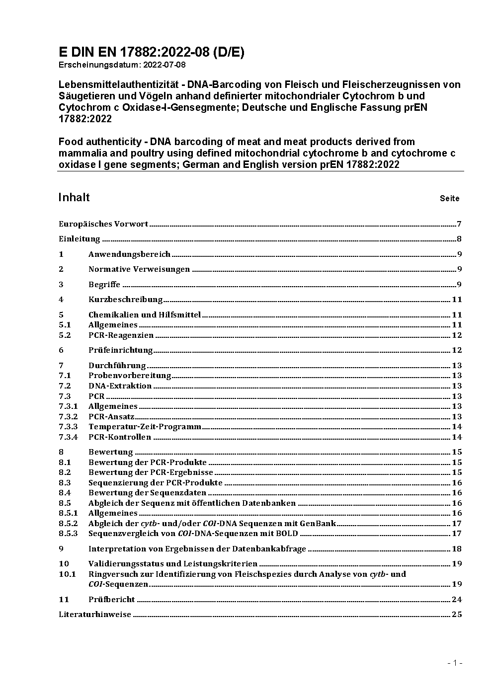 Food authenticity - DNA barcoding of meat derived from mammals and birds using defined mitochondrial cytochrome b and cytochrome c oxidase I gene segments; German version EN 17882:2024