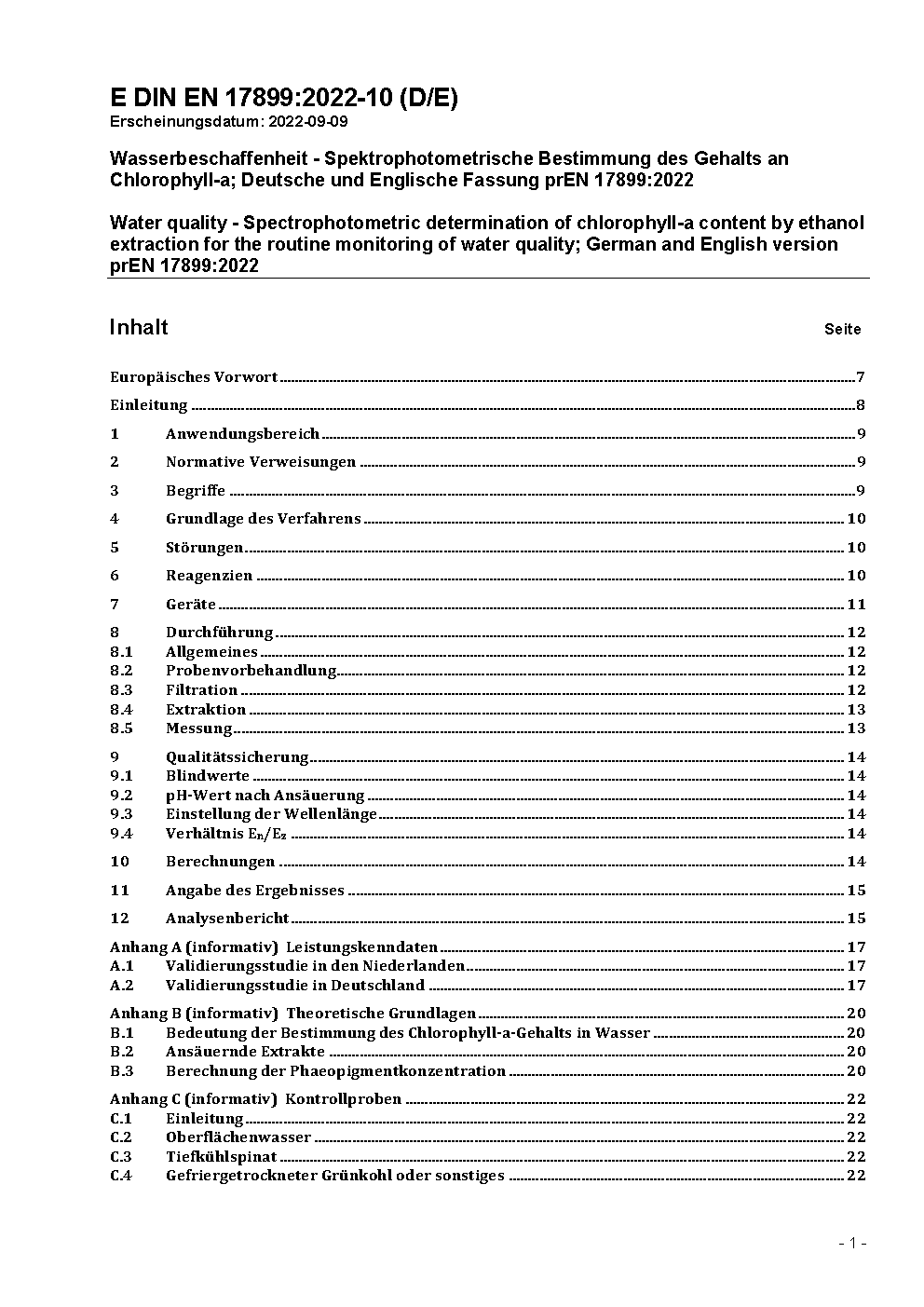 Water quality - Spectrophotometric determination of chlorophyll-a content by ethanol extraction for the routine monitoring of water quality; German and English version prEN 17899:2022