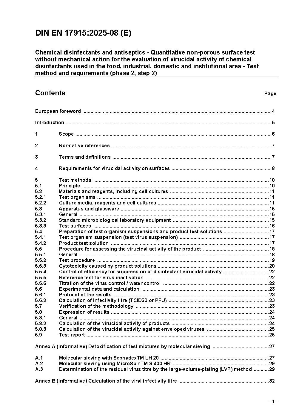 Chemical disinfectants and antiseptics - Quantitative carrier test method for the evaluation of virucidal activity of chemical disinfectants on hard non-porous surfaces in food, industrial, domestic and institutional areas - Test method and requirements (phase 2, step 2); German and English version prEN 17915:2022