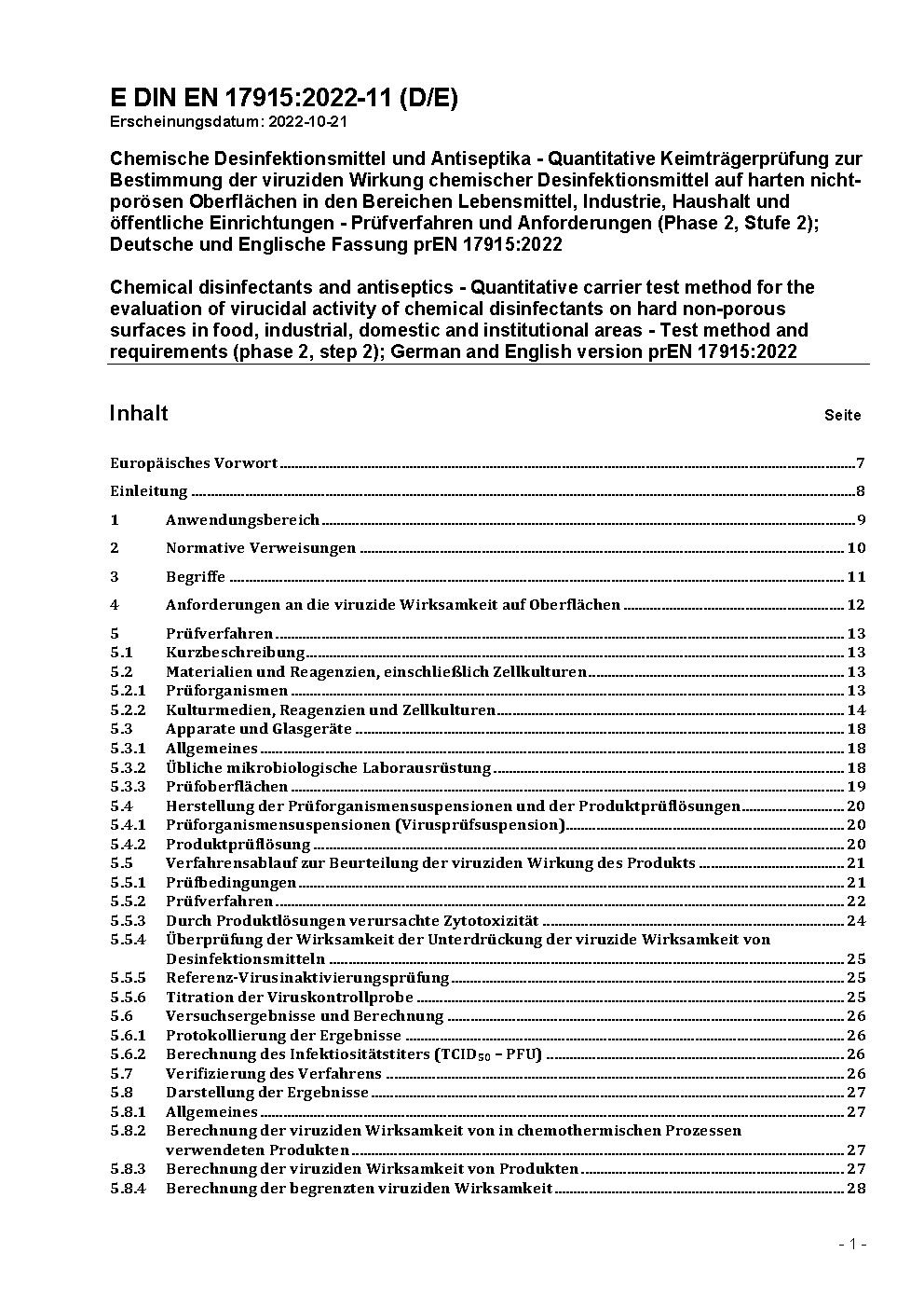 Chemische Desinfektionsmittel und Antiseptika - Quantitative Keimträgerprüfung zur Bestimmung der viruziden Wirkung chemischer Desinfektionsmittel auf harten nicht-porösen Oberflächen in den Bereichen Lebensmittel, Industrie, Haushalt und öffentliche Einrichtungen - Prüfverfahren und Anforderungen (Phase 2, Stufe 2); Deutsche und Englische Fassung prEN 17915:2022