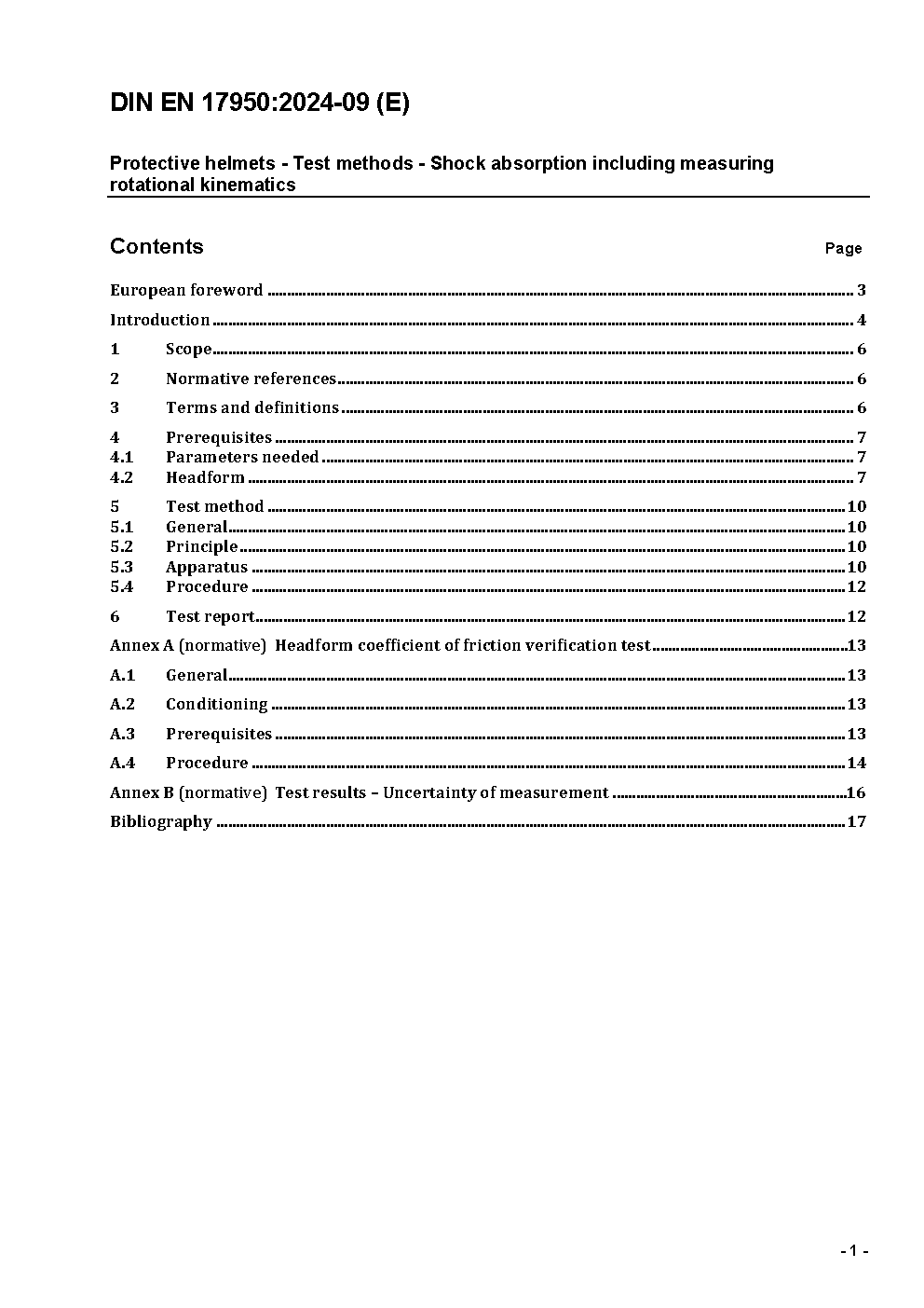 Protective helmets - Test methods - Shock absorption including measuring rotational kinematics; German and English version prEN 17950:2023.