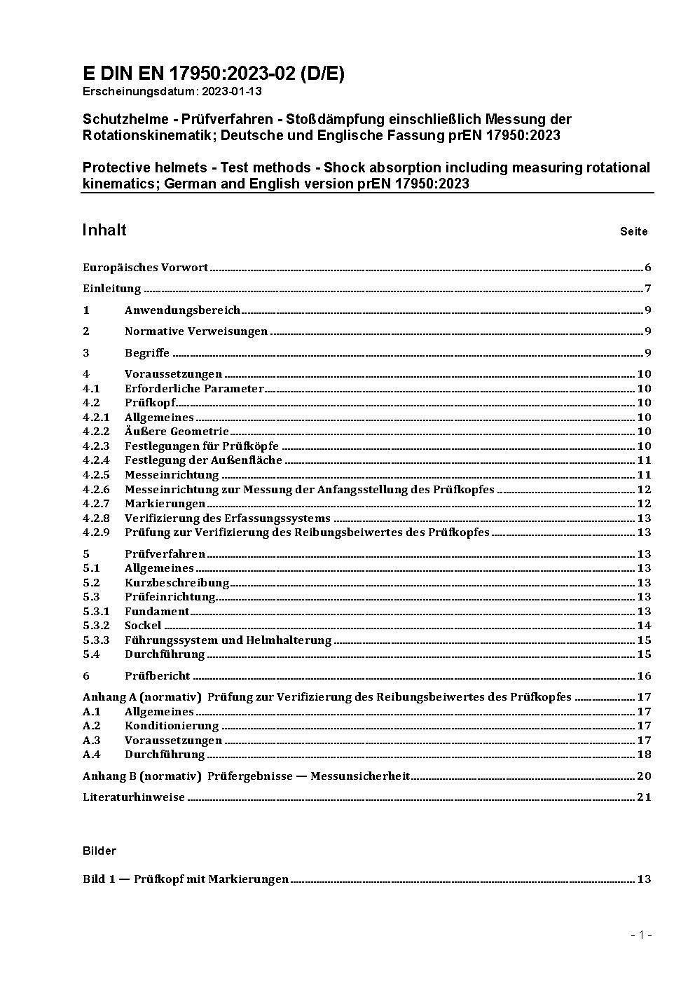 Schutzhelme - Prüfverfahren - Stoßdämpfung einschließlich Messung der Rotationskinematik; Deutsche und Englische Fassung prEN 17950:2023 / Achtung: CD-ROM